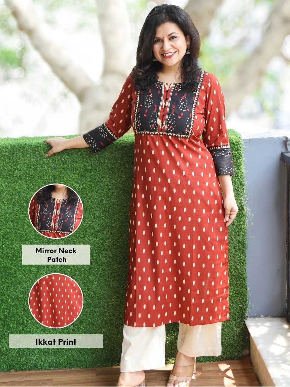 Chandruffi Burnt Fire Rust Mirror Neck Patch Work Ikkat Printed Cotton Kurti