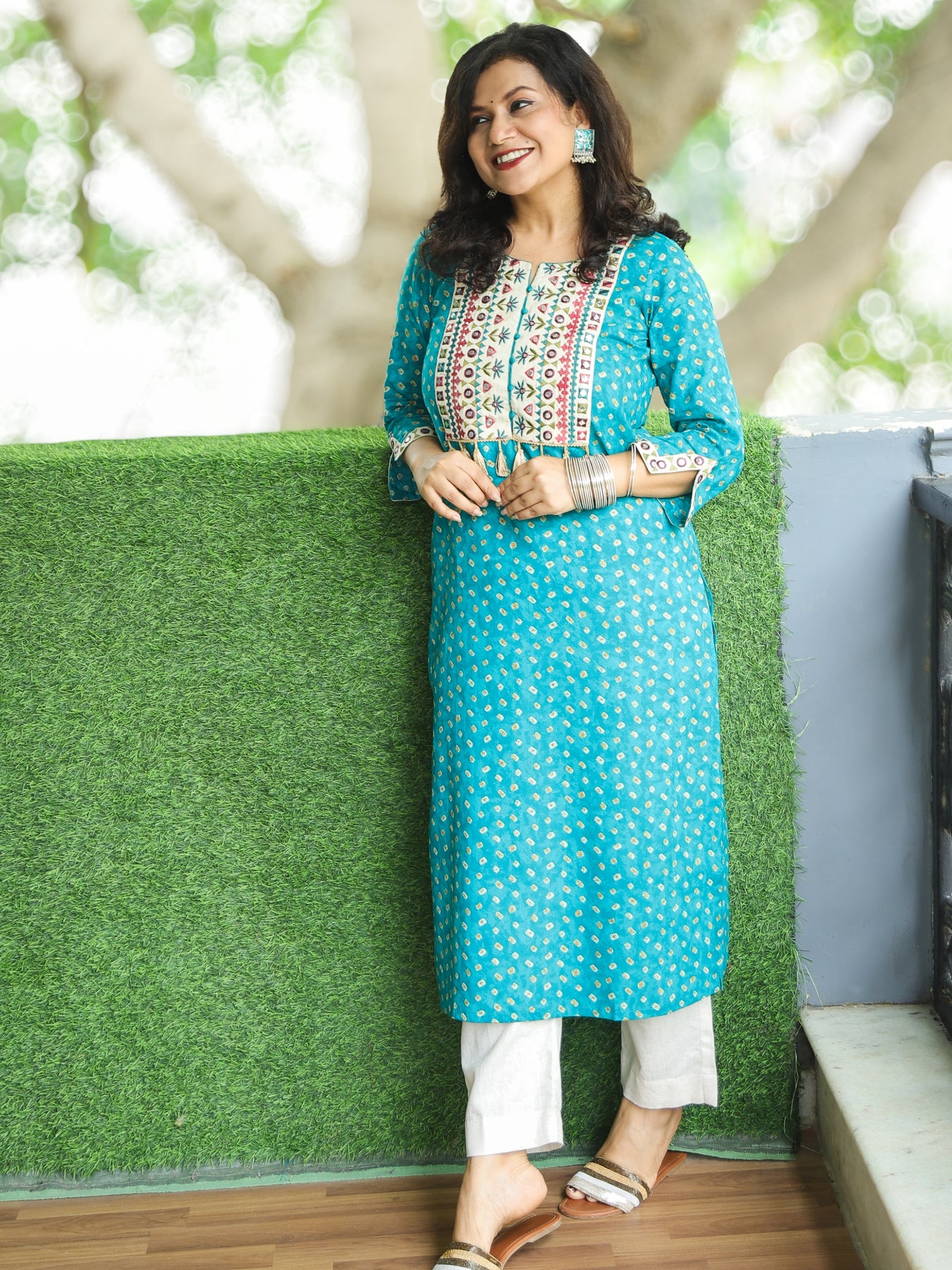 Varsha Aqua Teal Embroidered Yoke with Patra Work Bandhej Print Cotton Kurti