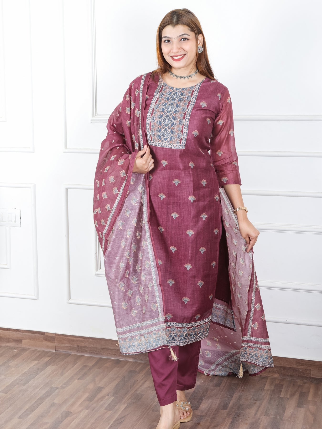Khushi Mulberry Purple Digital Printed Neck with Kantha Detailing Chanderi 3 Piece Set