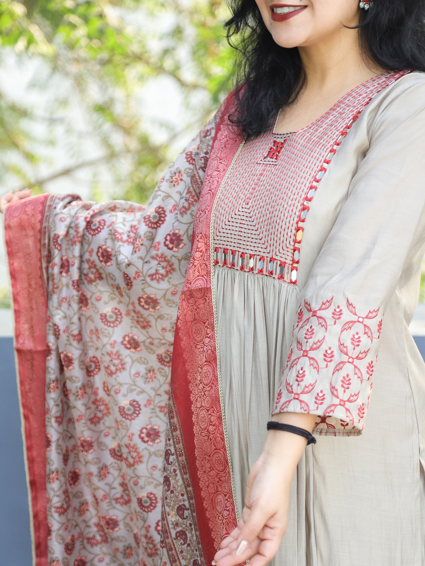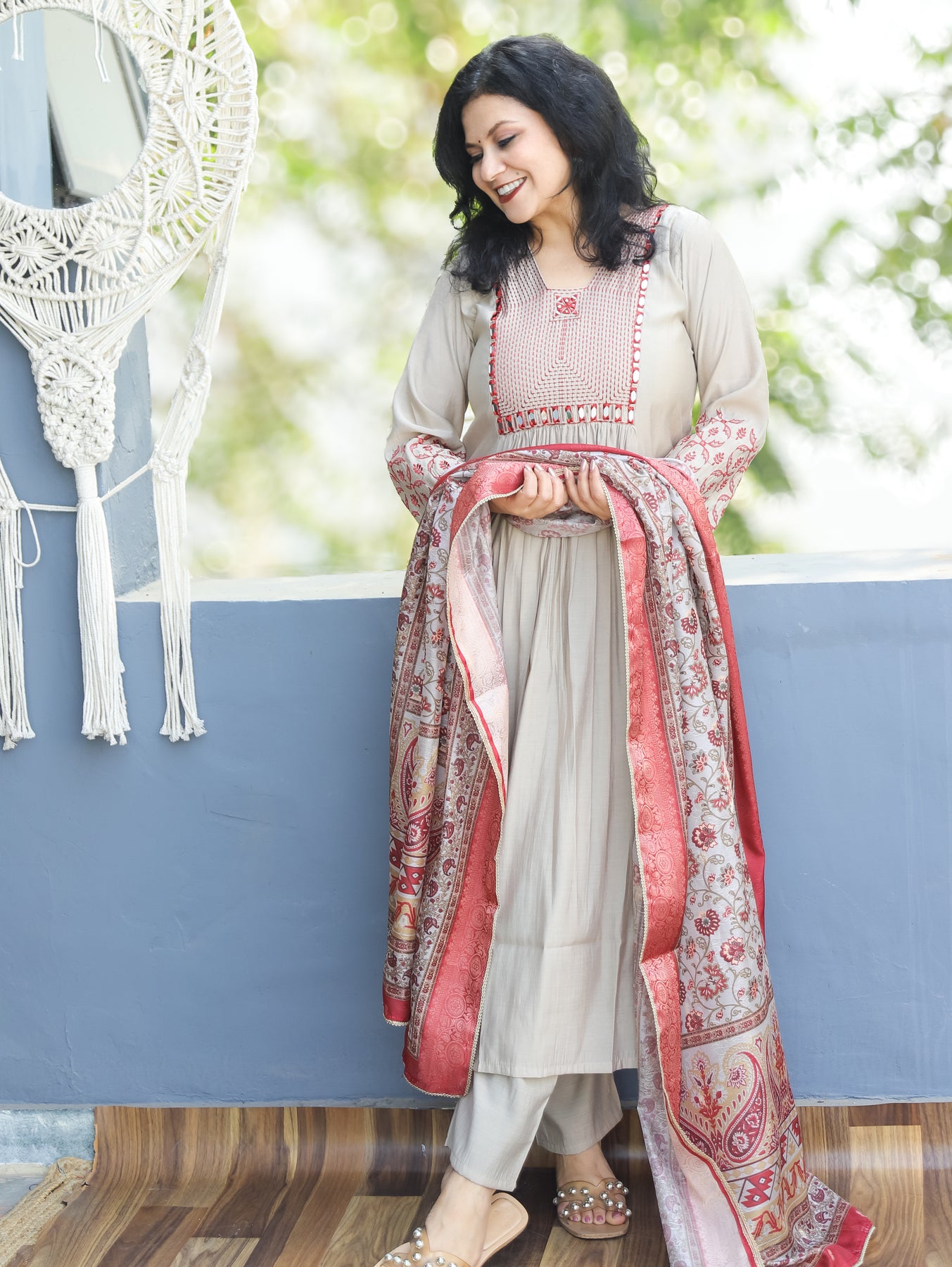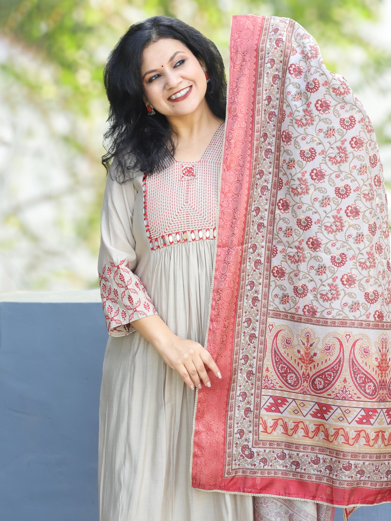 WORK- Embrace ethnic elegance with this roman silk suit set. The kurta features a V-neckline with a finely printed yoke, highlighted by delicate mirror work and a central embroidered patch with front gathered, giving it a festive charm. The sleeves are adorned with intricate thread detailing, adding to the overall grace. Paired with a matching solid bottom and a beautifully designed floral and paisley printed dupatta with woven border, this ensemble blends tradition with contemporary appeal, making it perfect for casual gatherings as well as festive occasions..