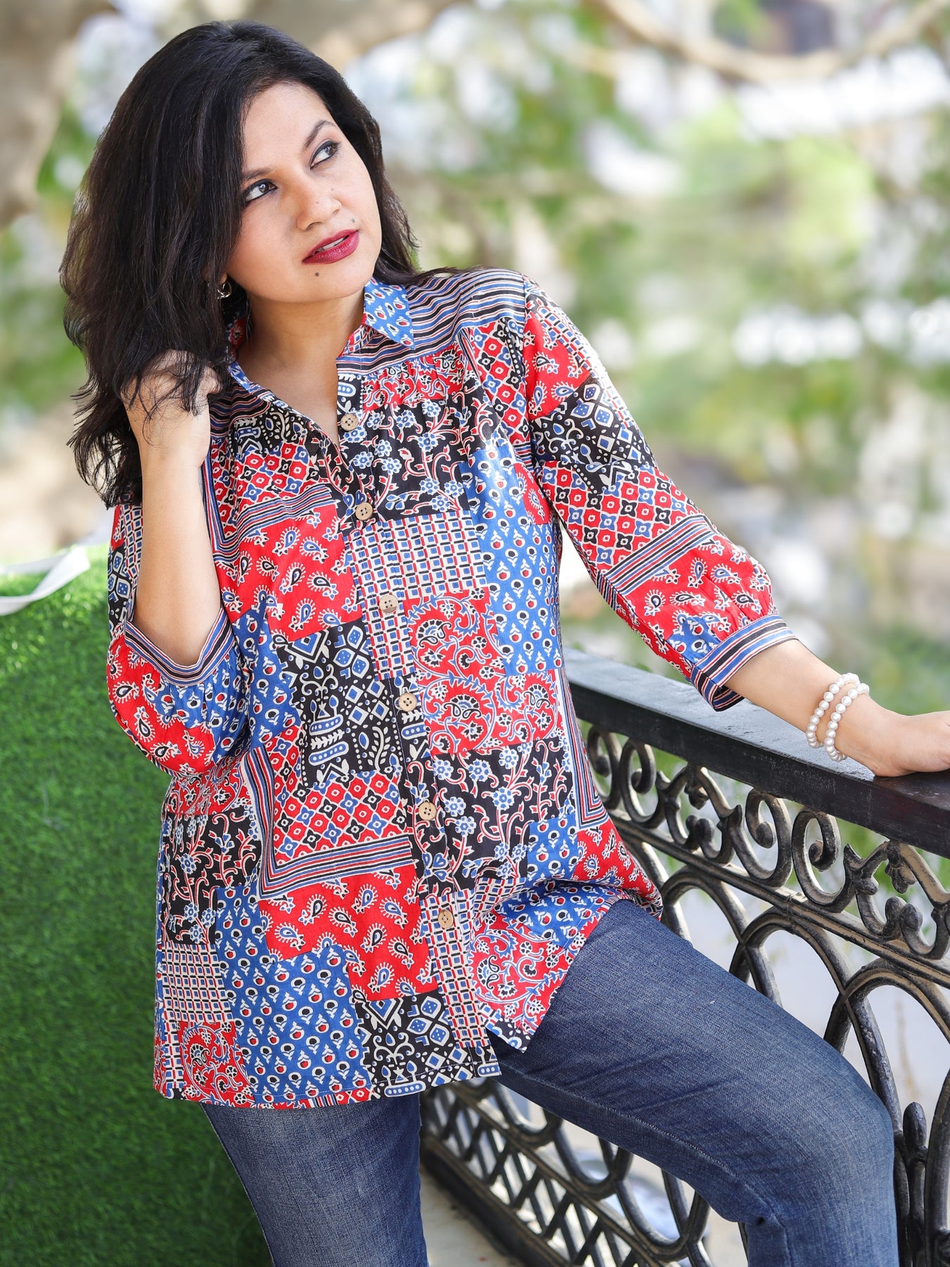 Premika Red and Blue Ajrak Patches Print with Button Work Short Cotton Shirt