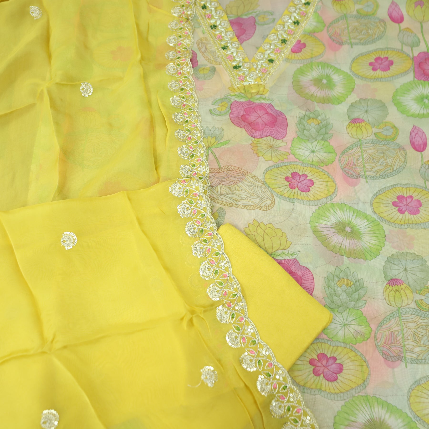 Work- This elegant organza suit set features a soft floral-printed top with a V-neckline embellished with intricate pita embroidery. It is paired with a matching plain bottom and a delicately bordered organza dupatta showcasing detailed cutwork and embroidered edges — perfect for a graceful festive look.