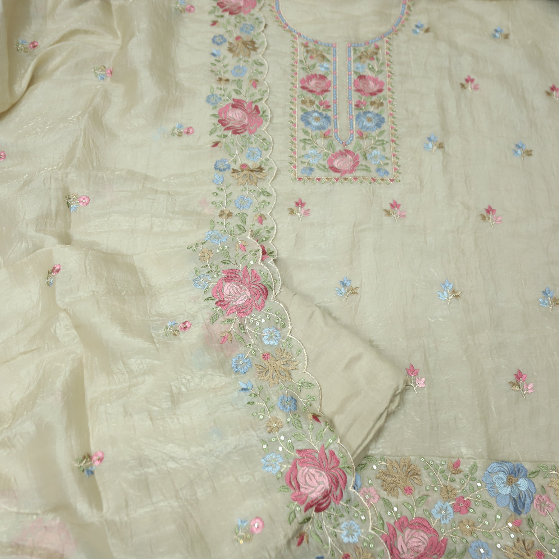 Ekta Hazel Beige with Blue Floral Embroidered Neck Work Crushed Tissue Suit Set