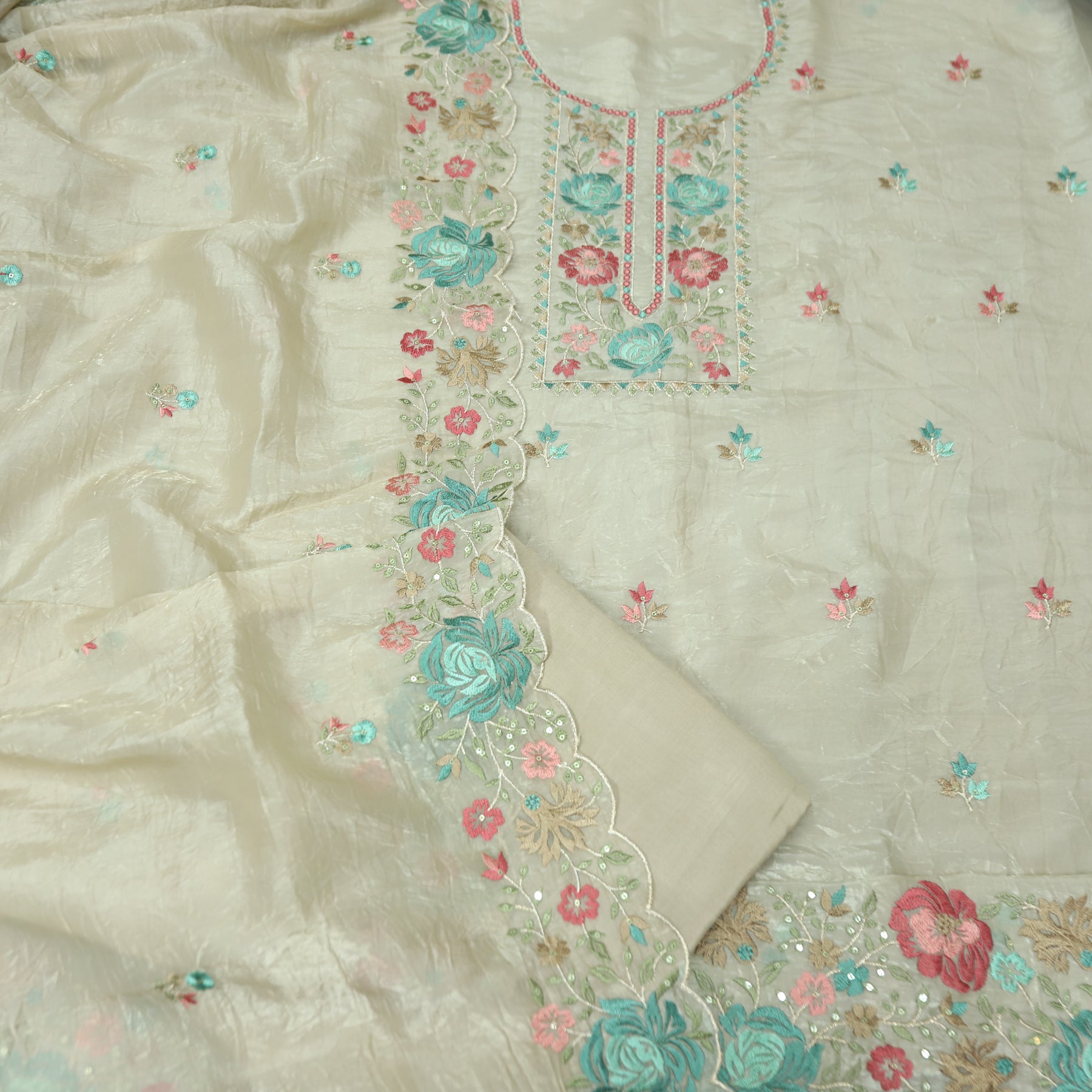 Ekta Hazel Beige with Aqua Floral Embroidered Neck Work Crushed Tissue Suit Set
