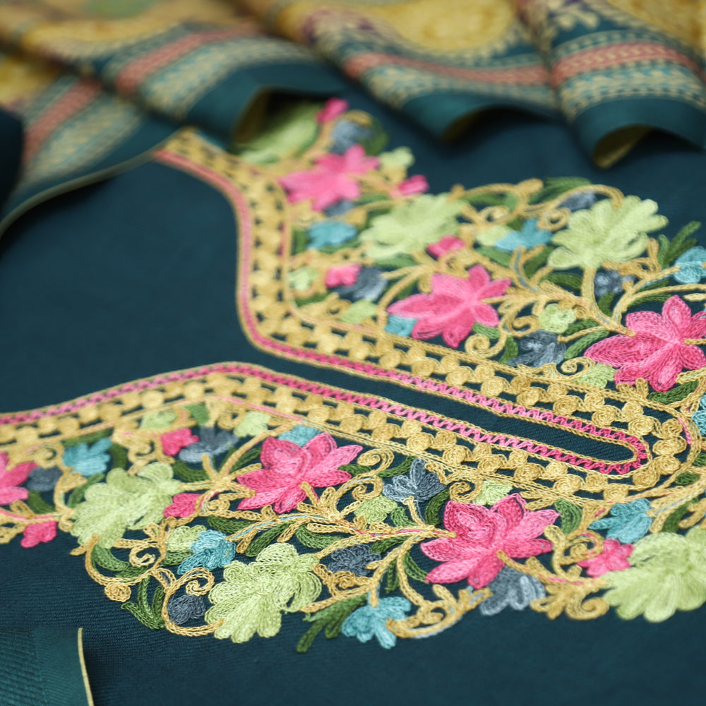 कनक Dark Green Kashida Embroidery Work Semi Pashmina Winter Set