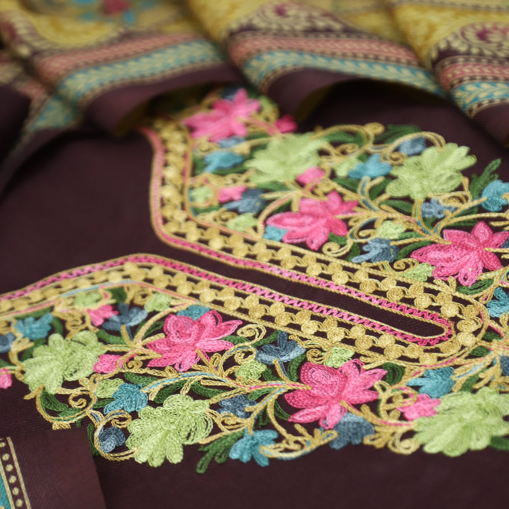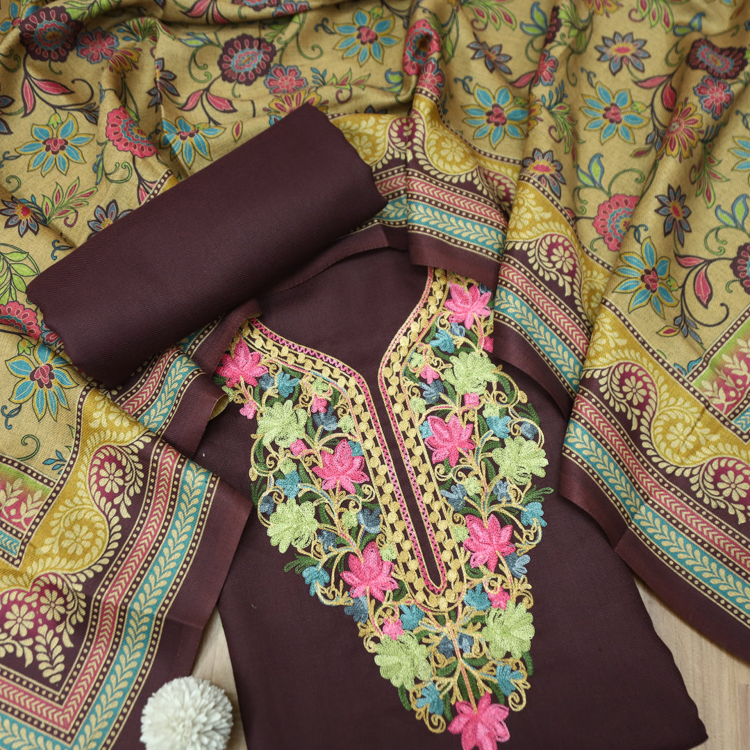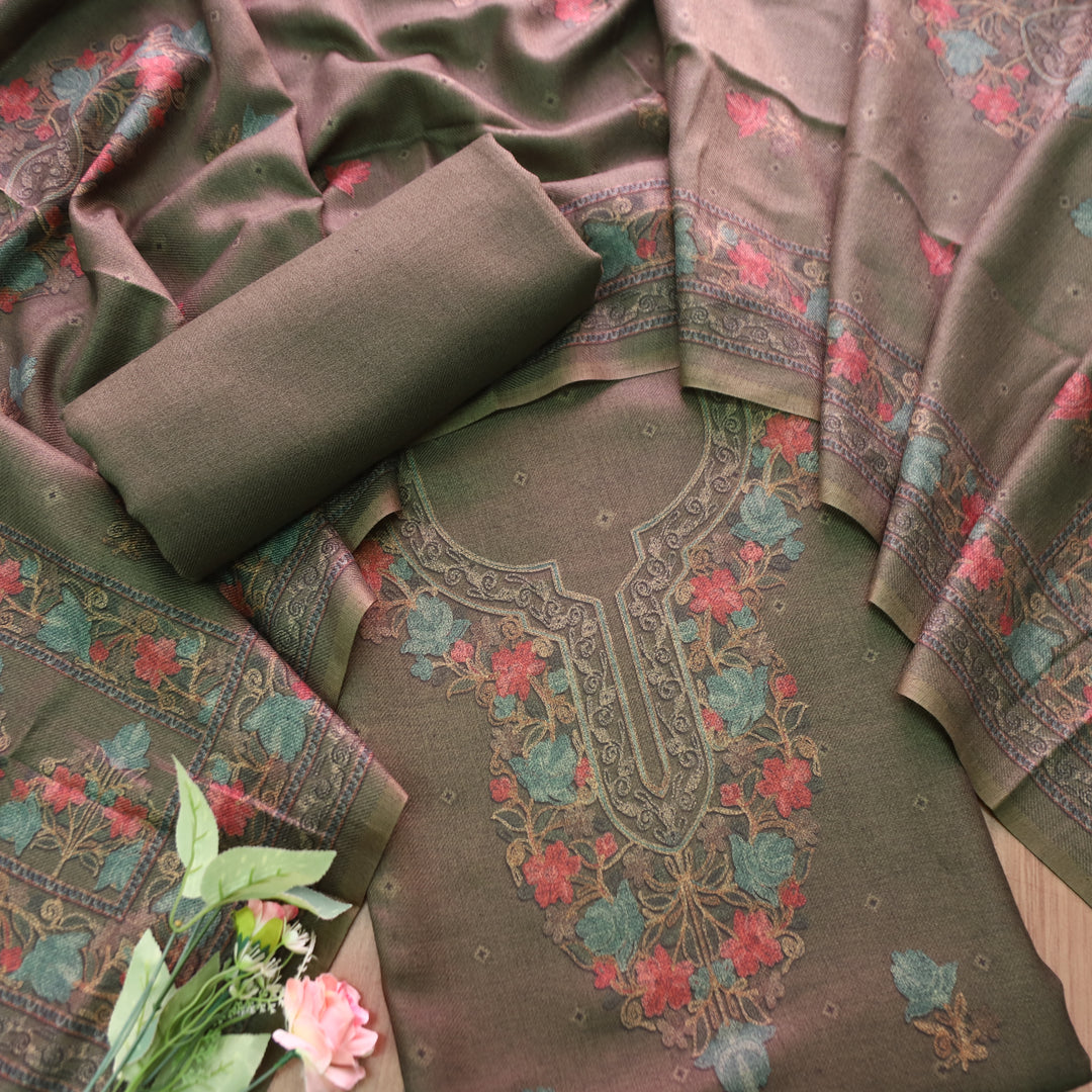 कनक Olive Brown Kashida Embroidery Work Semi Pashmina Winter Set