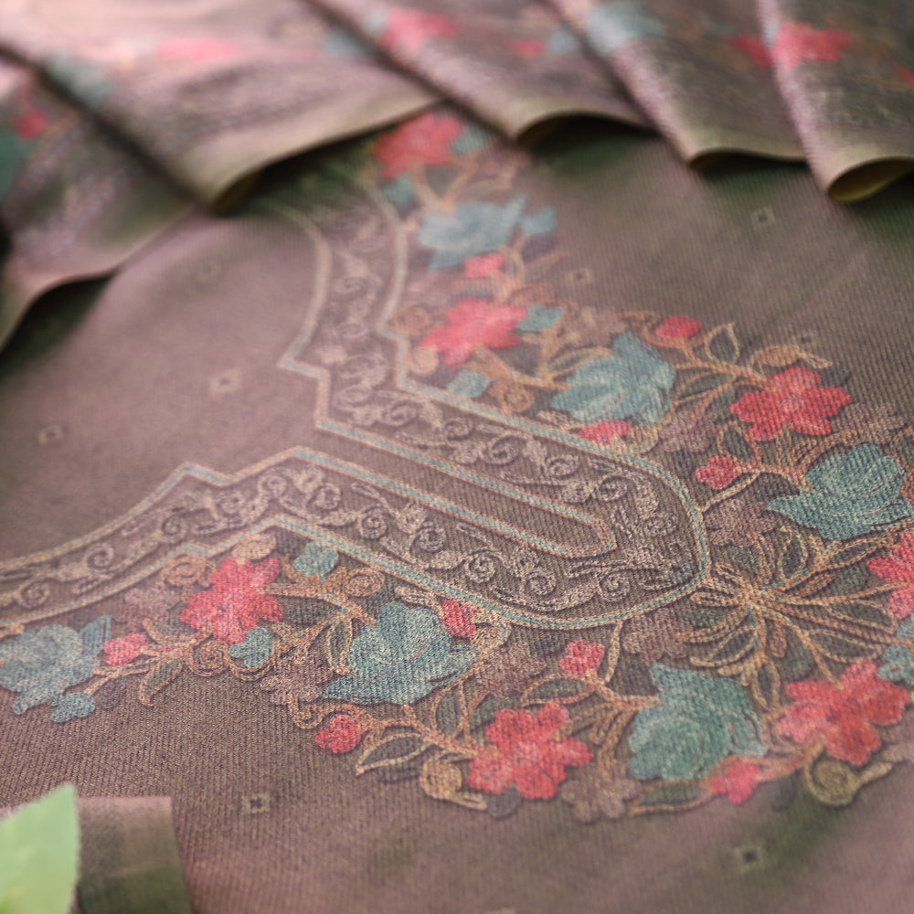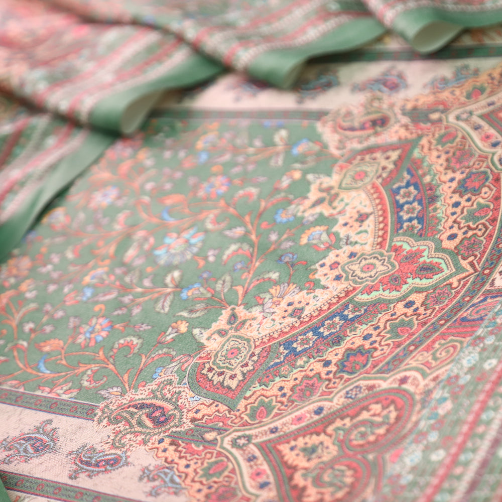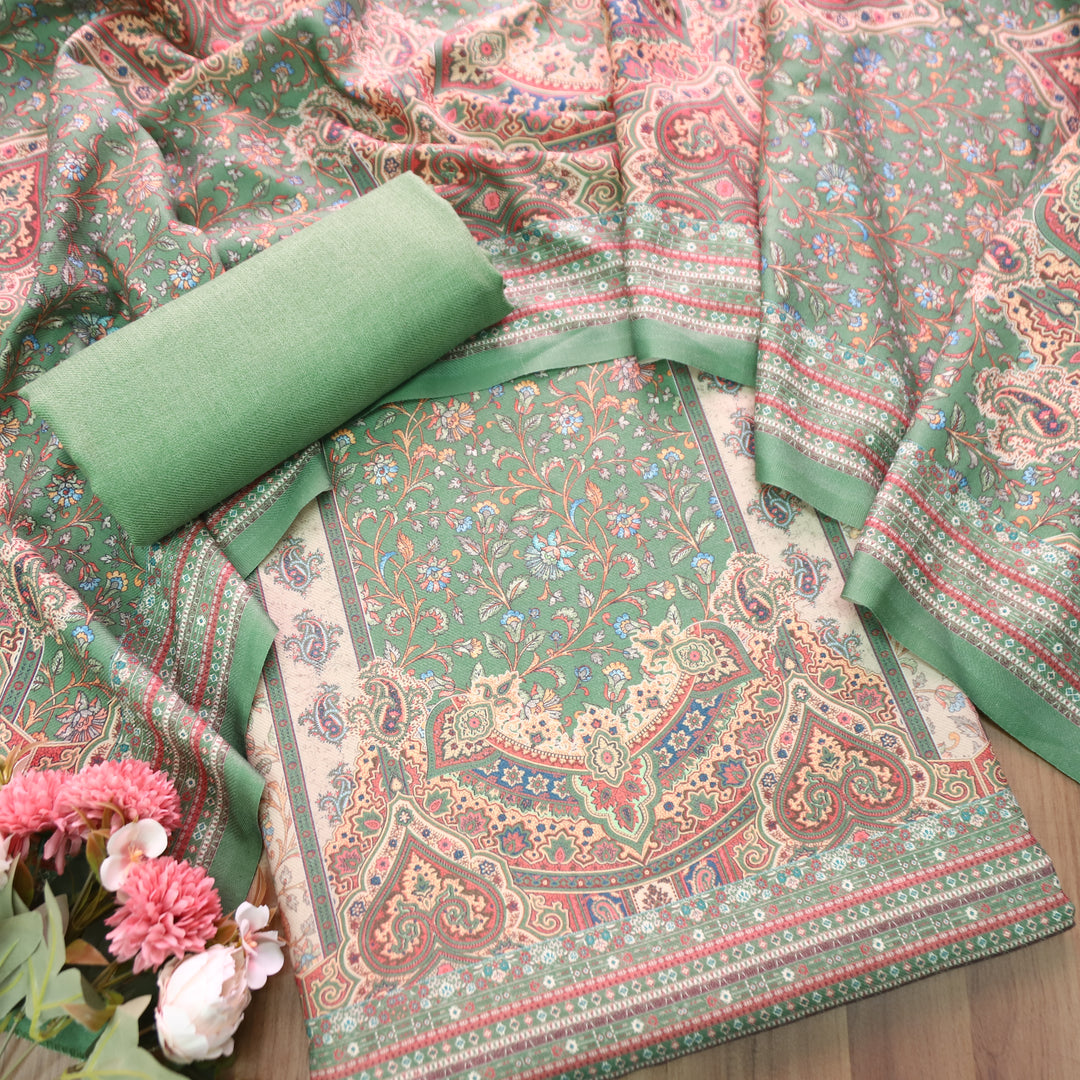 Raashi Pine Green Panel Styel Digitial Kashmiri Print Semi Pashmina Winter Set
