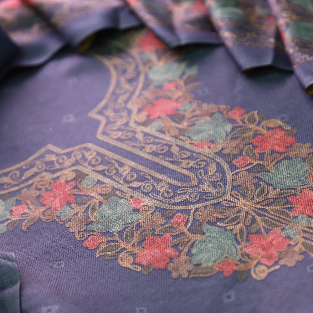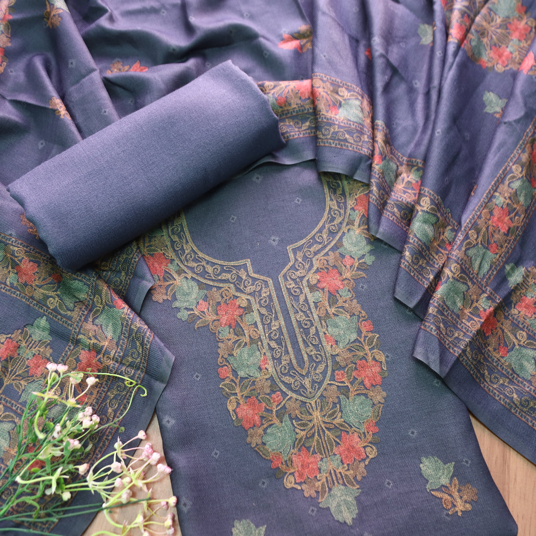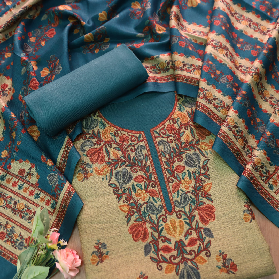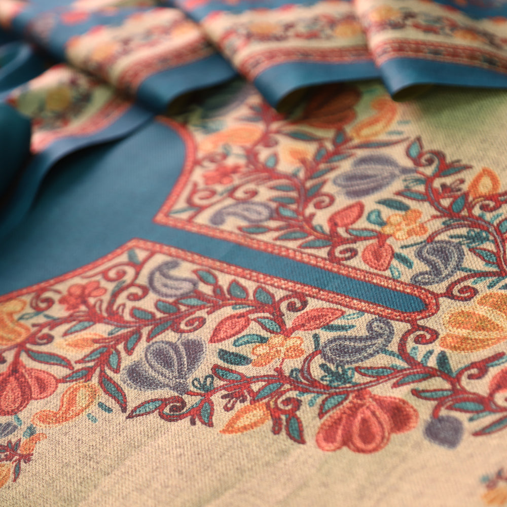 Anandi Beige with Blue Kashida Digital Printed Semi Pashmina Winter Set