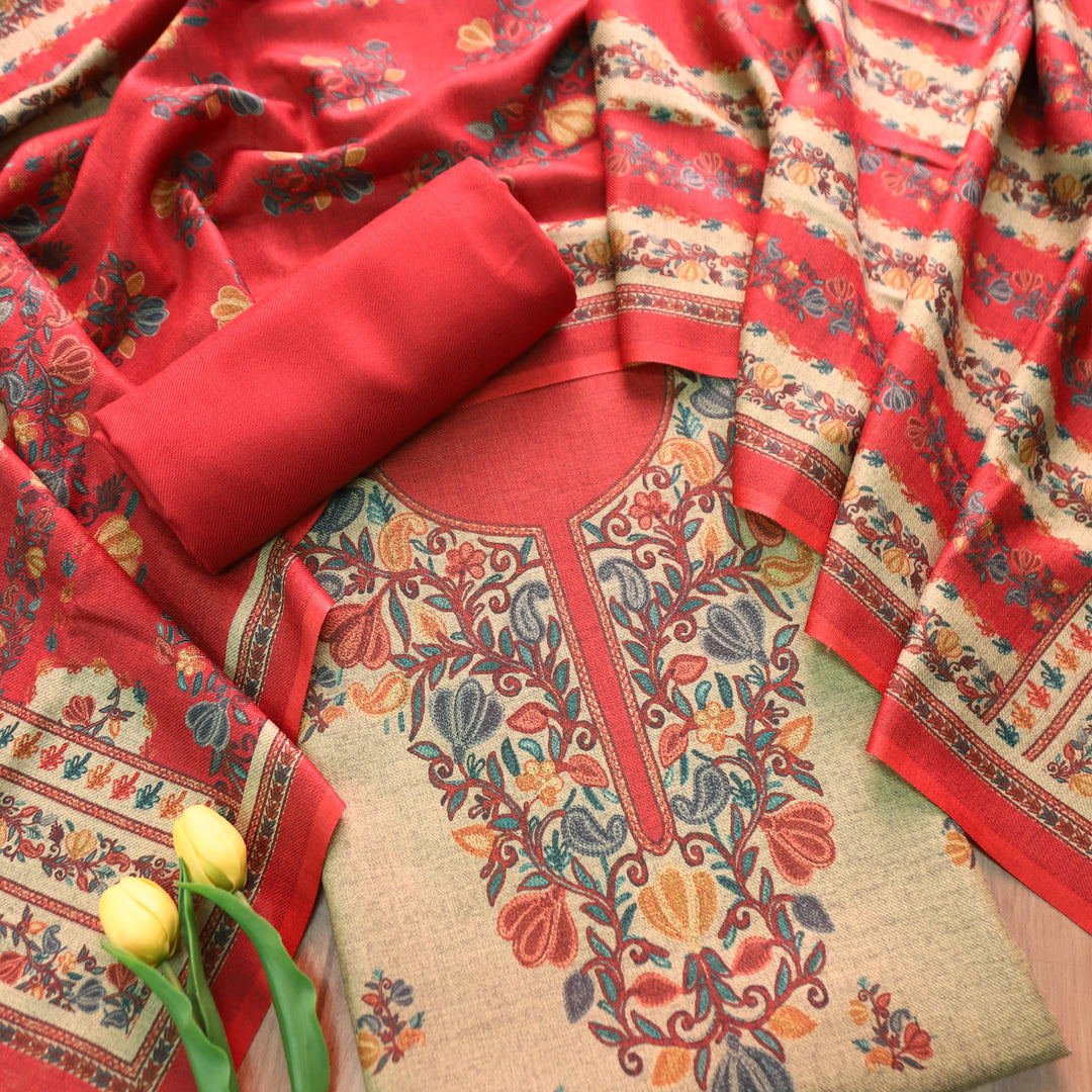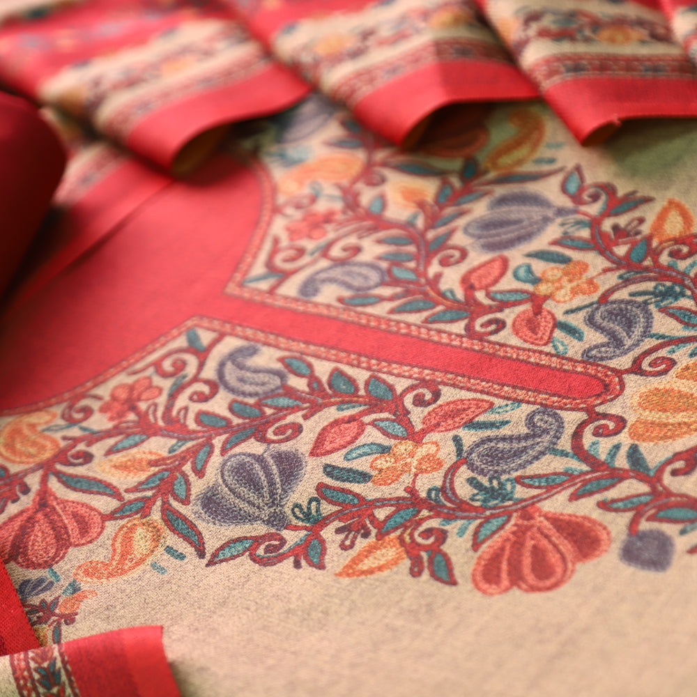 Anandi Beige with Red Kashida Digital Printed Semi Pashmina Winter Set