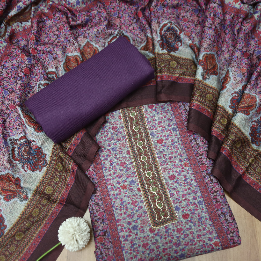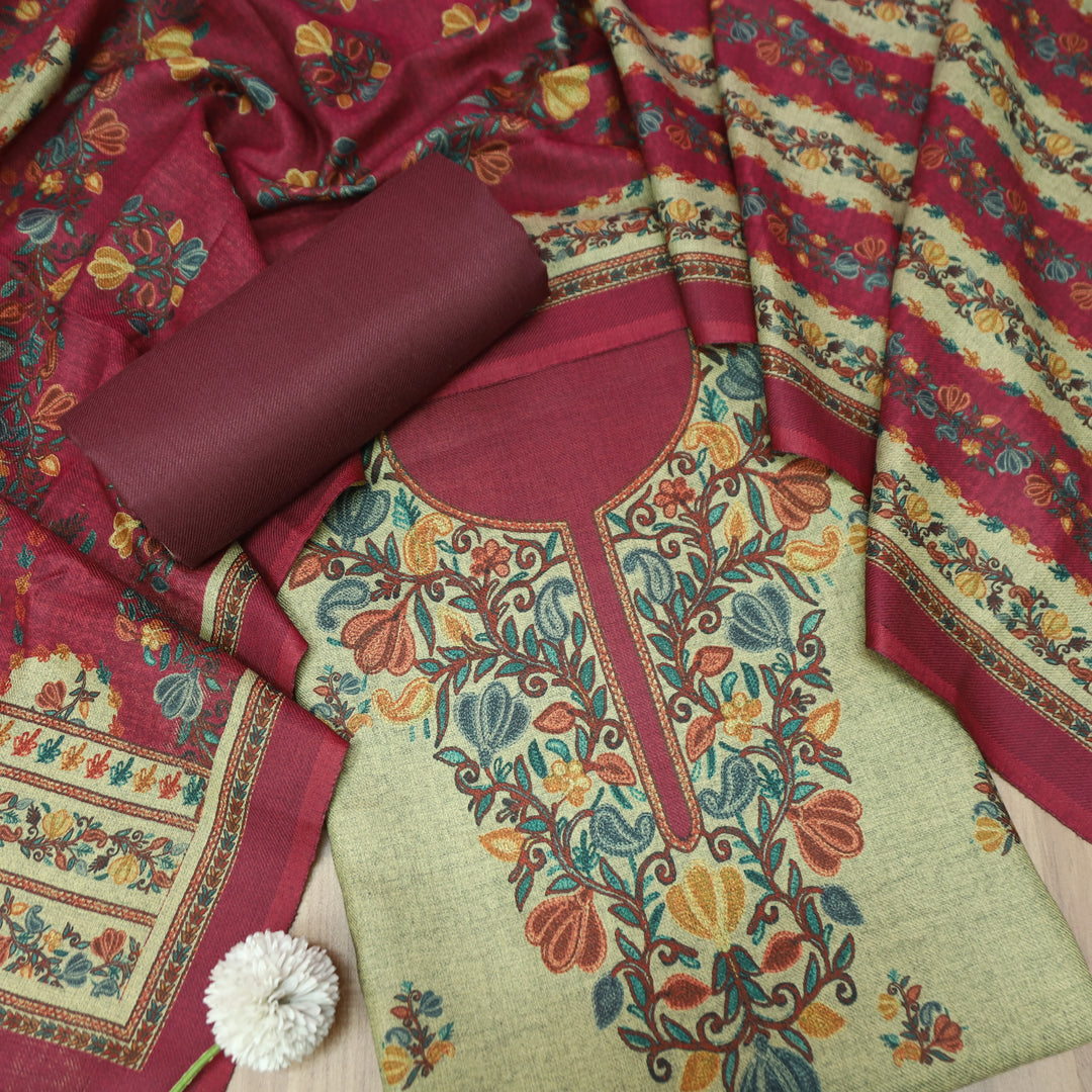 Anandi Beige with Wine Kashida Digital Printed Semi Pashmina Winter Set