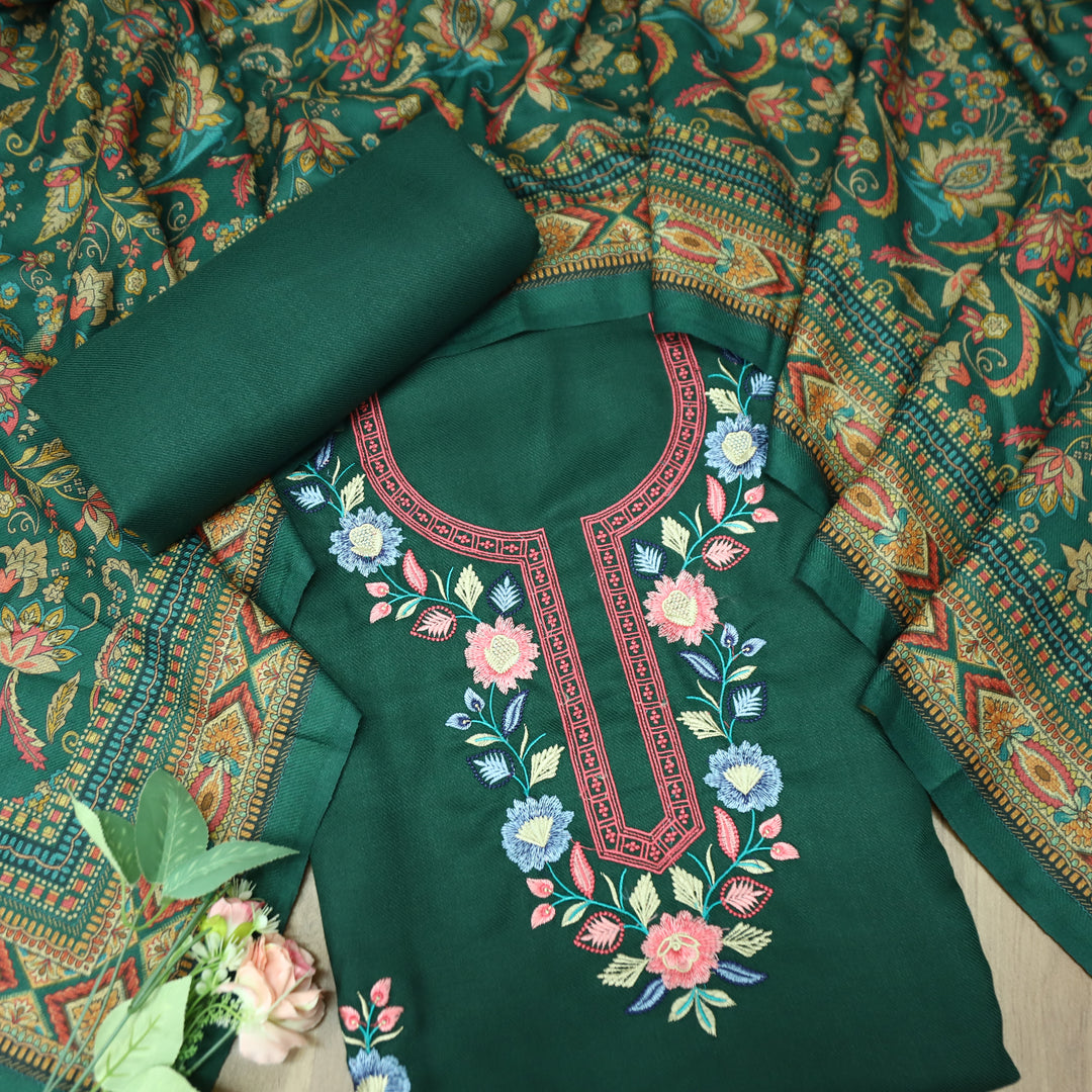 भानु Dark Green with Elegant All Over Embroidery Work Semi Pashmina winter Set