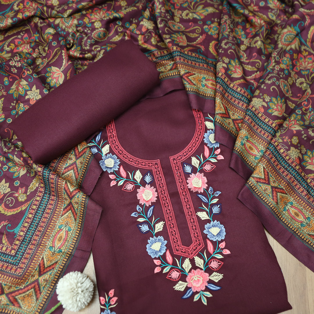 भानु Dark Wine with Elegant All Over Embroidery Work Semi Pashmina winter Set