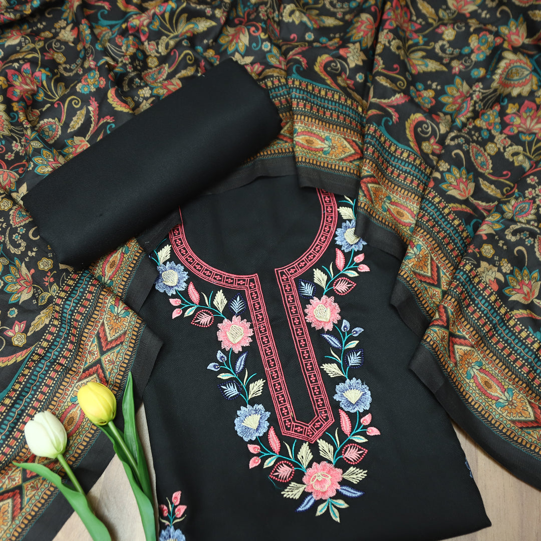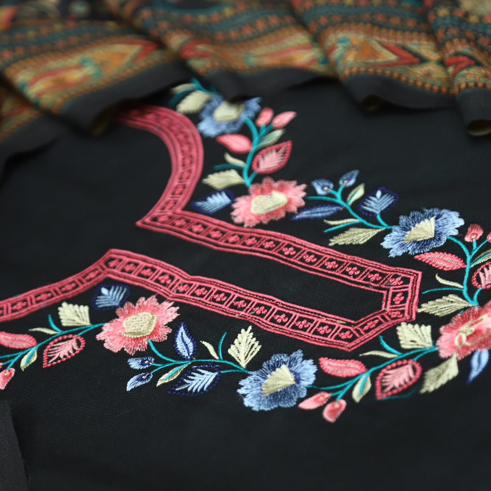 भानु Ebony Black with Elegant All Over Embroidery Work Semi Pashmina winter Set