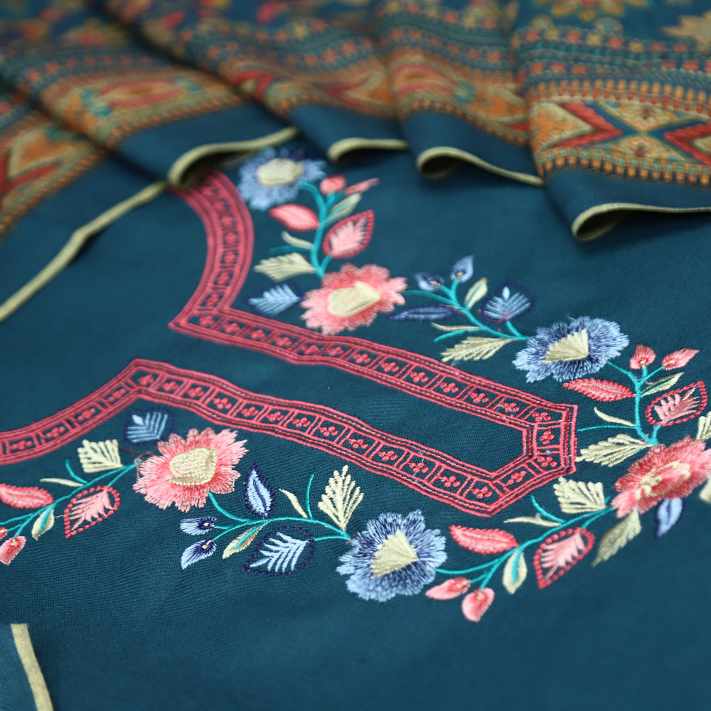 भानु Denim Blue with Elegant All Over Embroidery Work Semi Pashmina winter Set