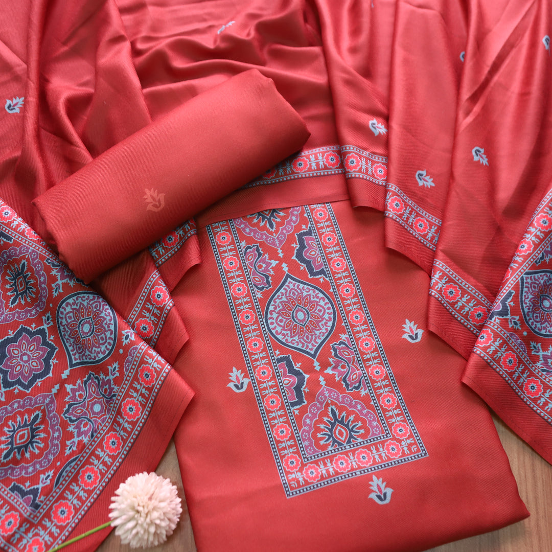 करिश्मा Coral Rust wth Elegant Ajrak Ada Printed Semi Pashmina Winter Set