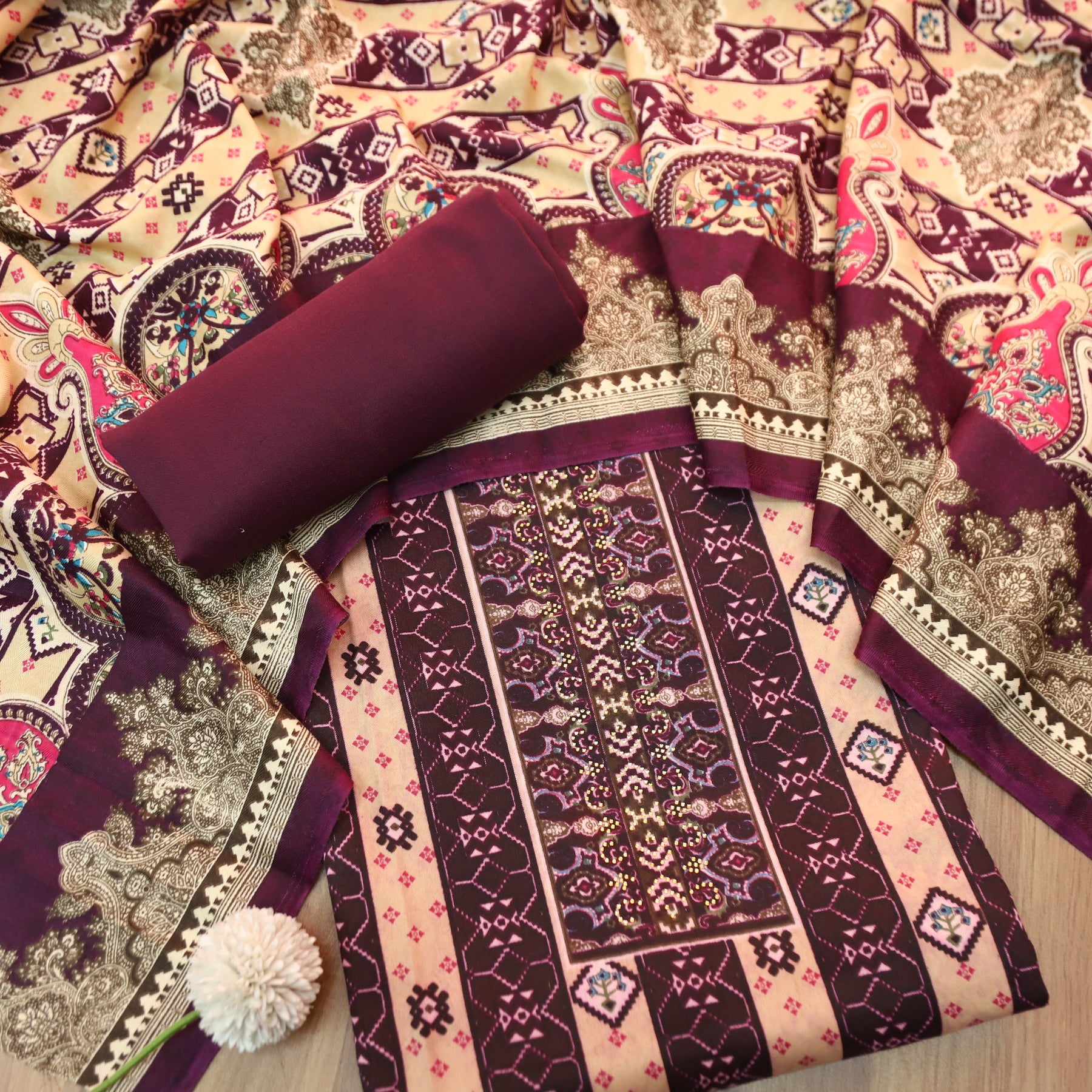आरजू Dark Wine Swarovski Work with Digital Printed Semi Pashmina Winter Set