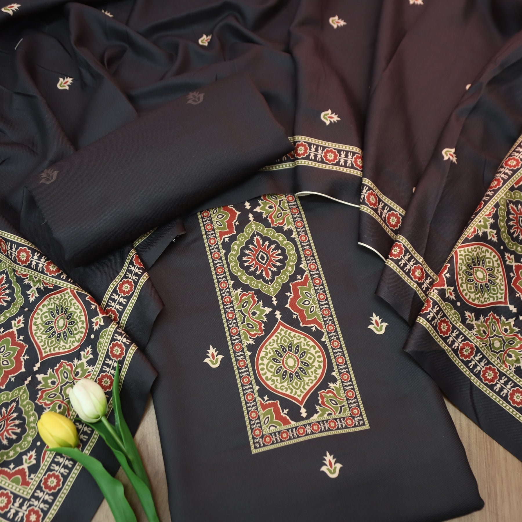 Work- This is a Sandook Ajrak Ada printed semi pashmina suit set, beautifully crafted with traditional Ajrak-inspired motifs in earthy tones. The intricate patterns on the yoke and border give it a rich ethnic appeal, while the soft semi pashmina fabric adds warmth and elegance — perfect for timeless, graceful styling..