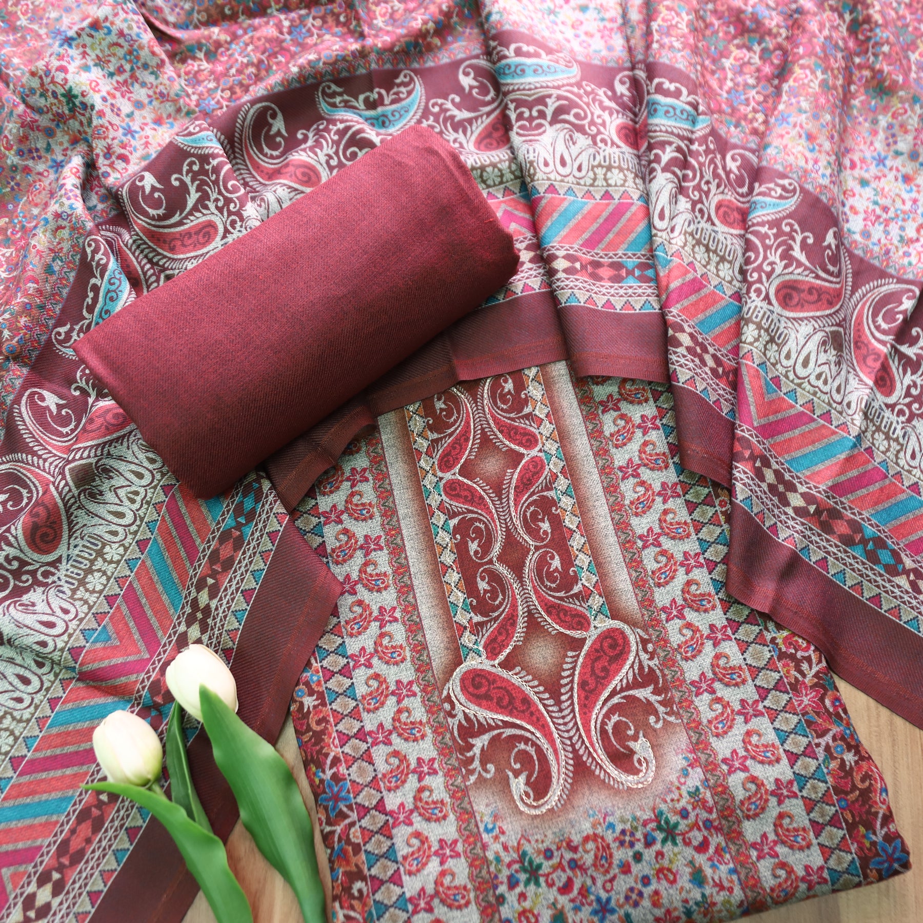 Work- This semi-pashmina suit set features an intricately printed top in rich maroon tones with paisley and geometric motifs, paired with a matching plain bottom. The coordinated printed dupatta completes the look with vibrant hues and elegant patterns — perfect for a cozy, stylish winter statement.