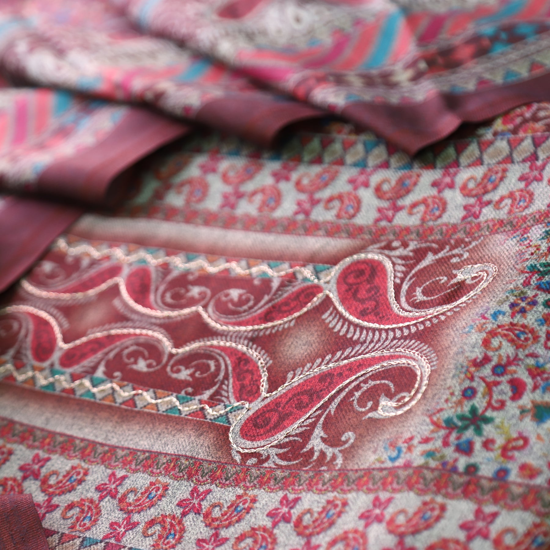 चित्रा Berry Maroon Chain Style Zari work Paisely Printed Semi Pashmina Winter Set