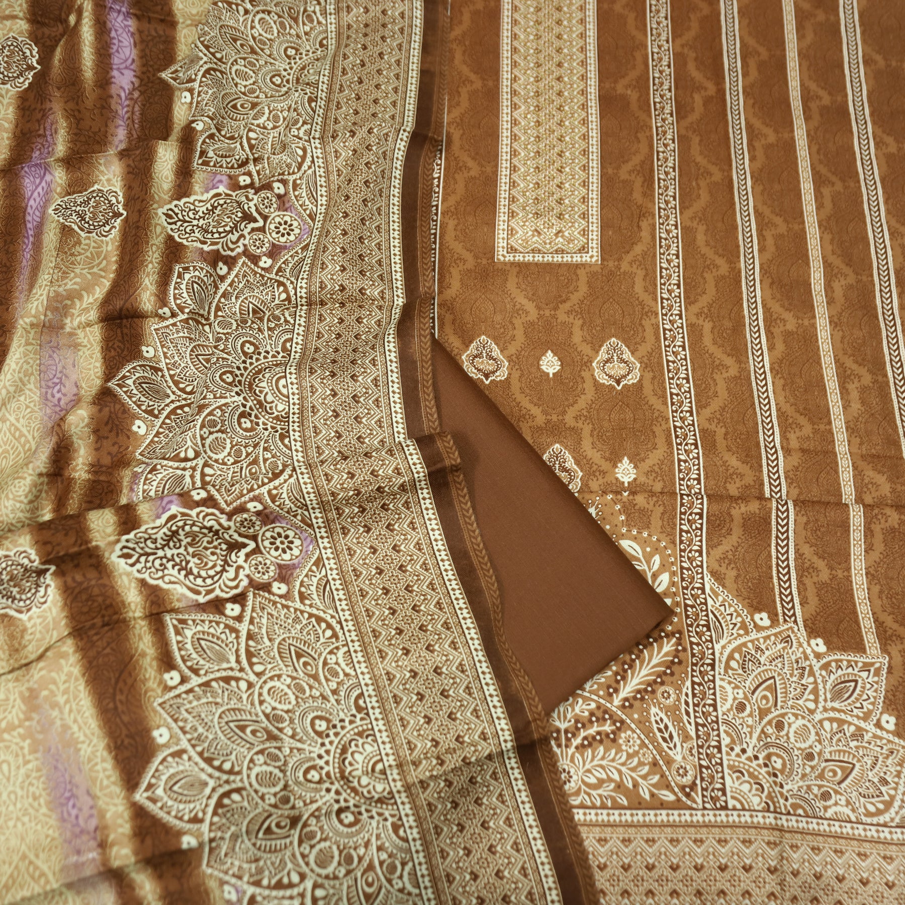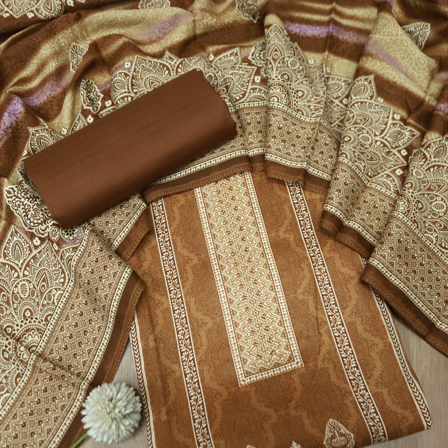 फरीदा Caramel Brown Panel Style Printed with Swarovski Semi Pashmina Winter Set