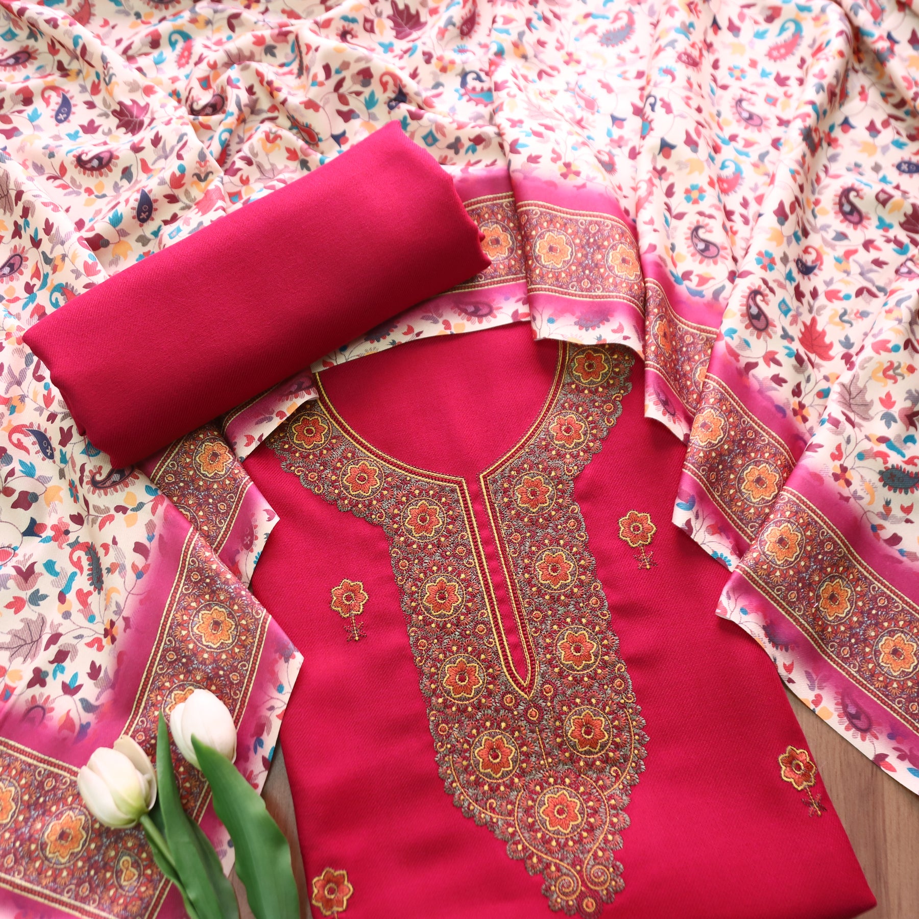 राजोहरी Bright Pink Thread Embroidery Work Semi Pashmina Winter Set