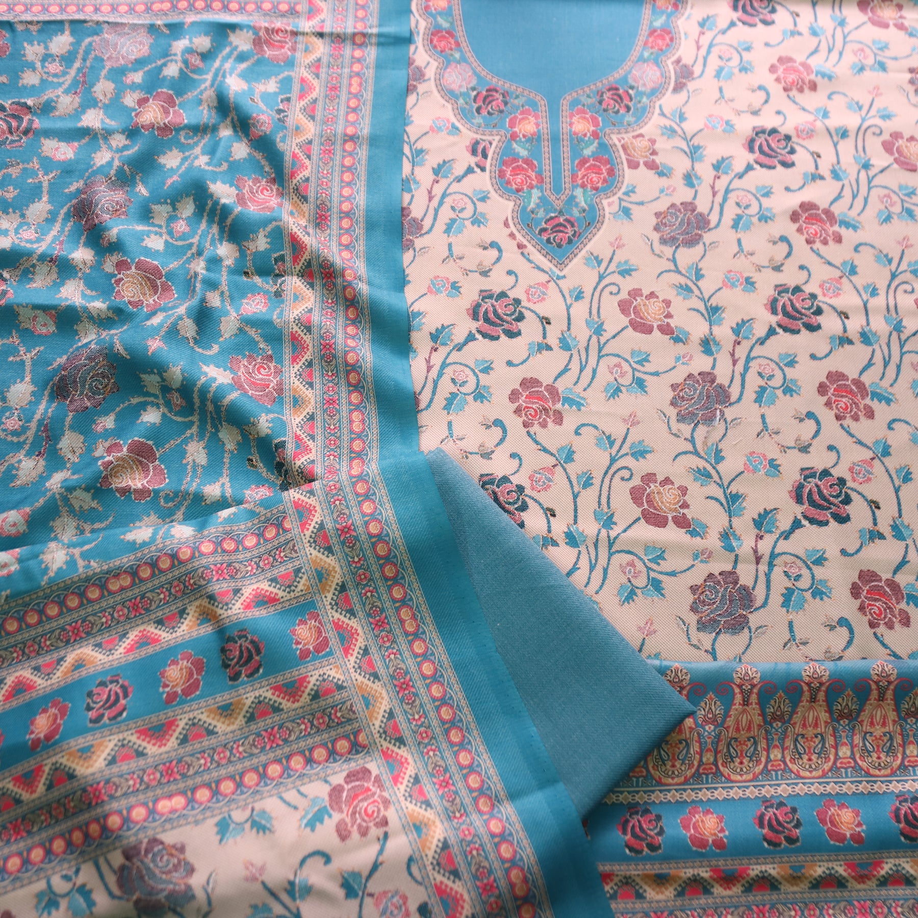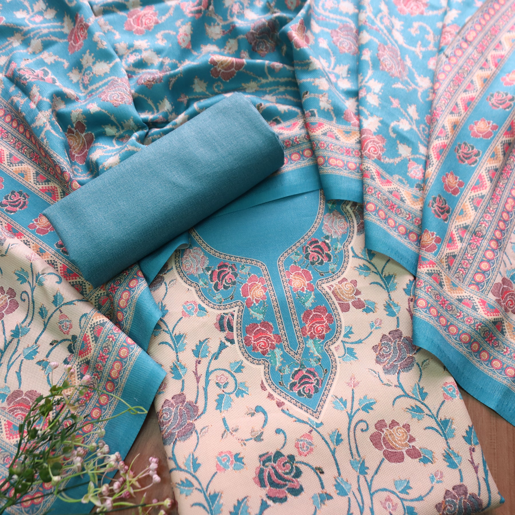 राधिका Amber Blue All Over Floral Print Semi Pashmina Winter Suit Set