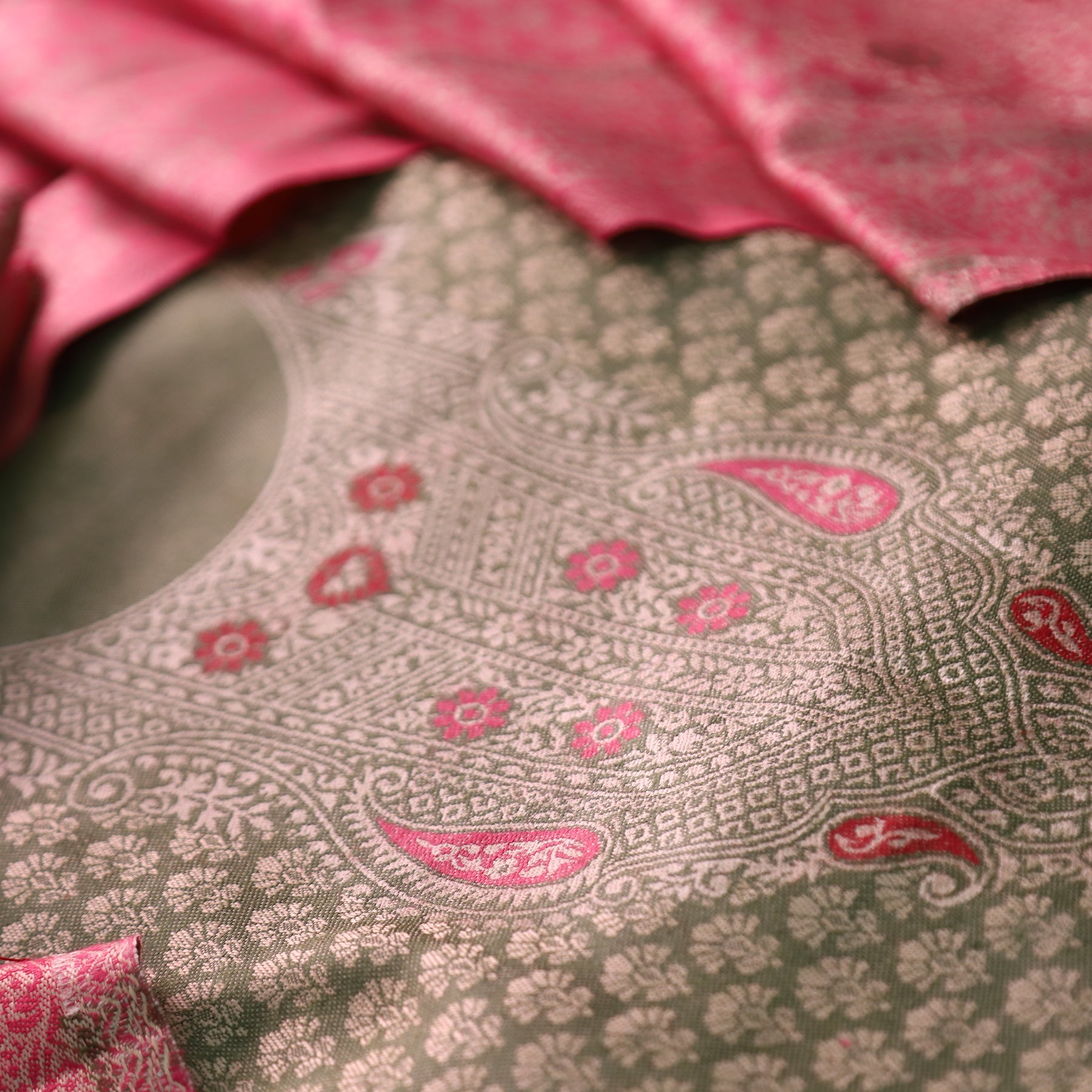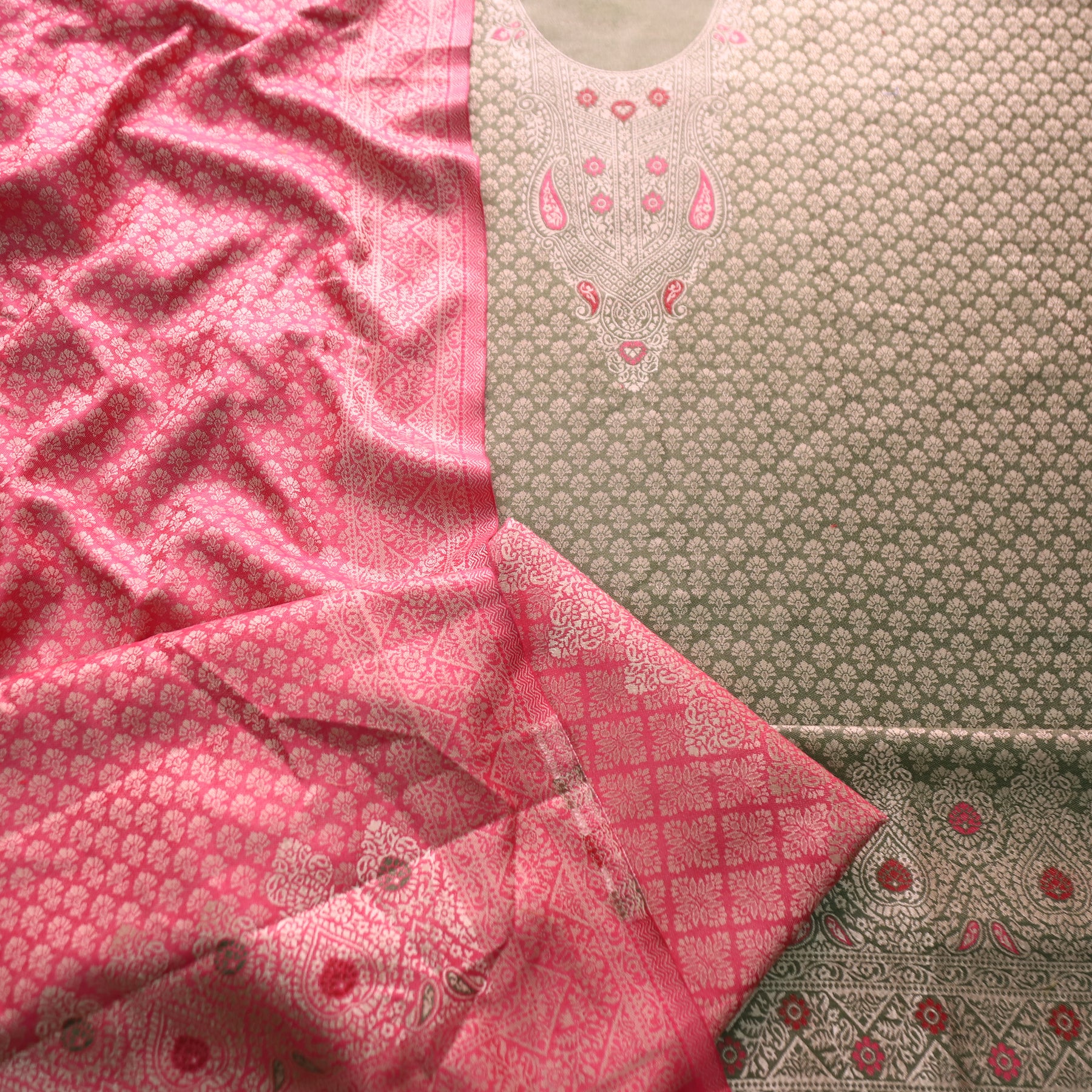 Work- A graceful semi pashmina suit set featuring a beautifully patterned top paired with a contrast zari-woven dupatta. The intricate weaving details and rich texture lend this ensemble a timeless charm, perfect for adding warmth and elegance to your winter wardrobe.