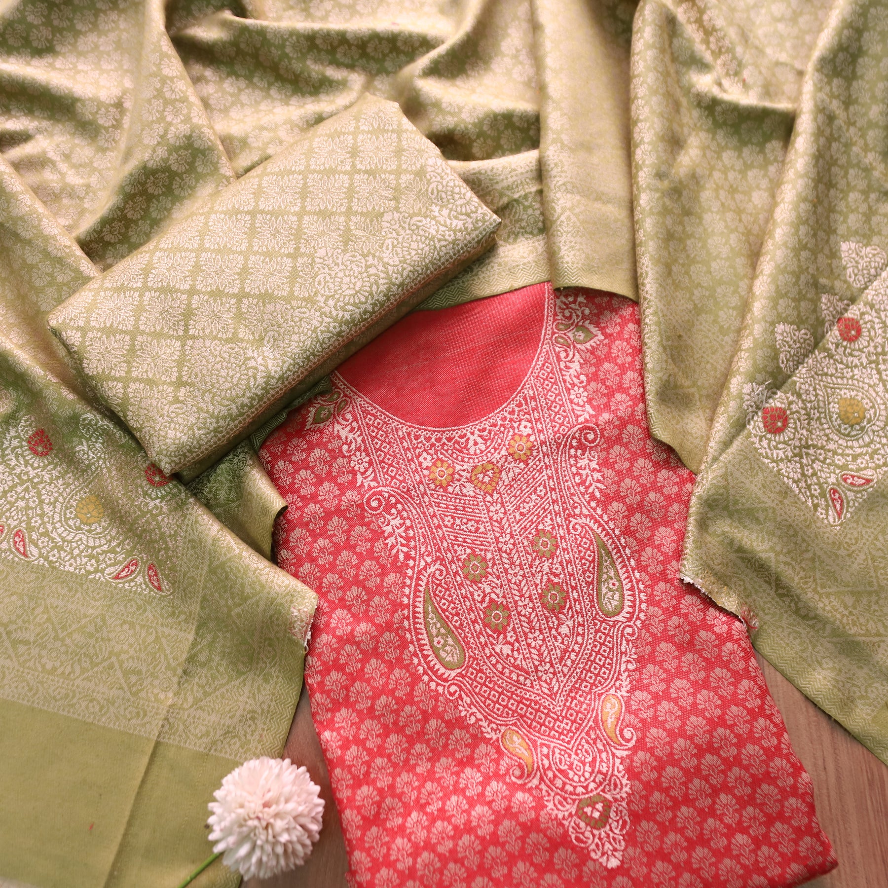 Work- A graceful semi pashmina suit set featuring a beautifully patterned top paired with a contrast zari-woven dupatta. The intricate weaving details and rich texture lend this ensemble a timeless charm, perfect for adding warmth and elegance to your winter wardrobe.