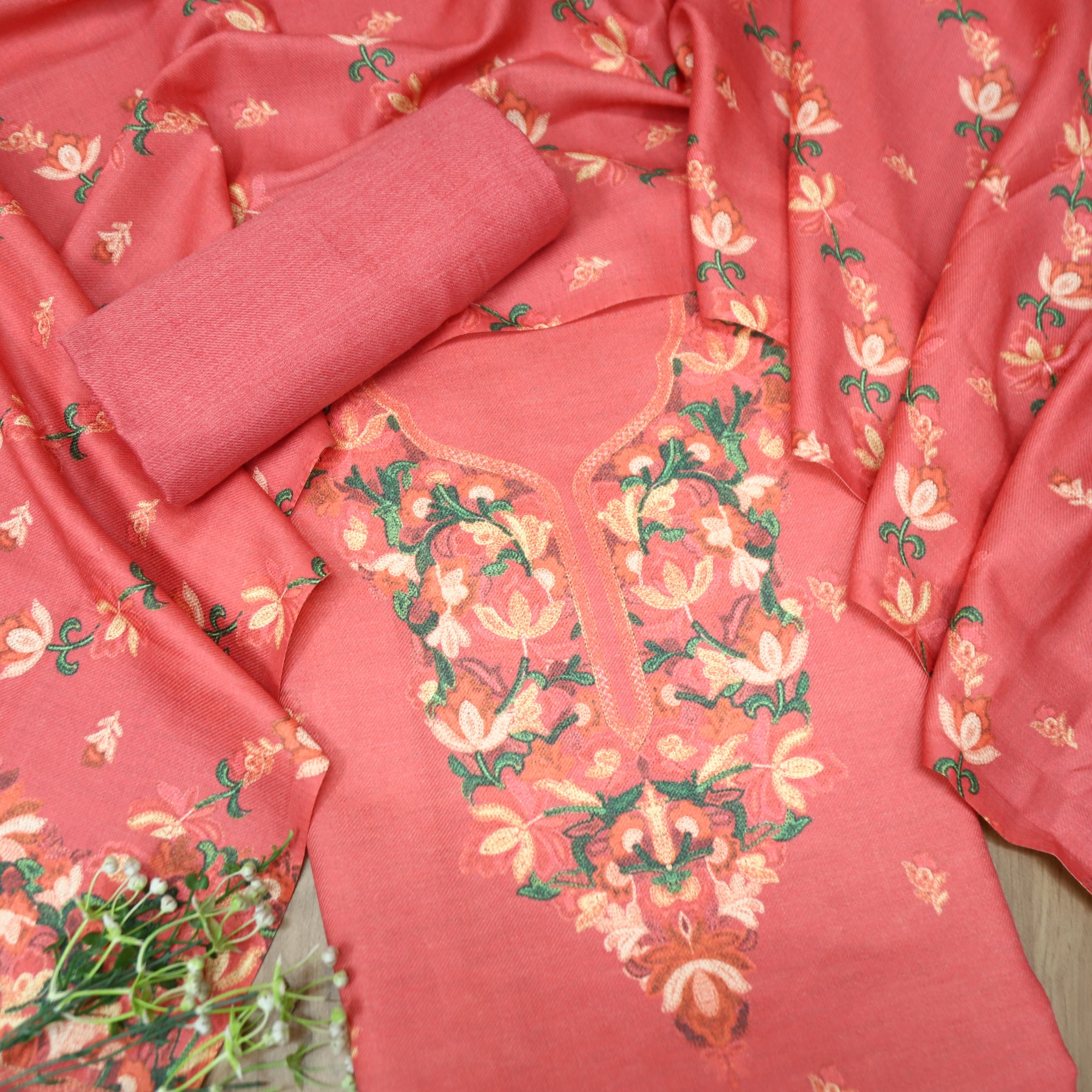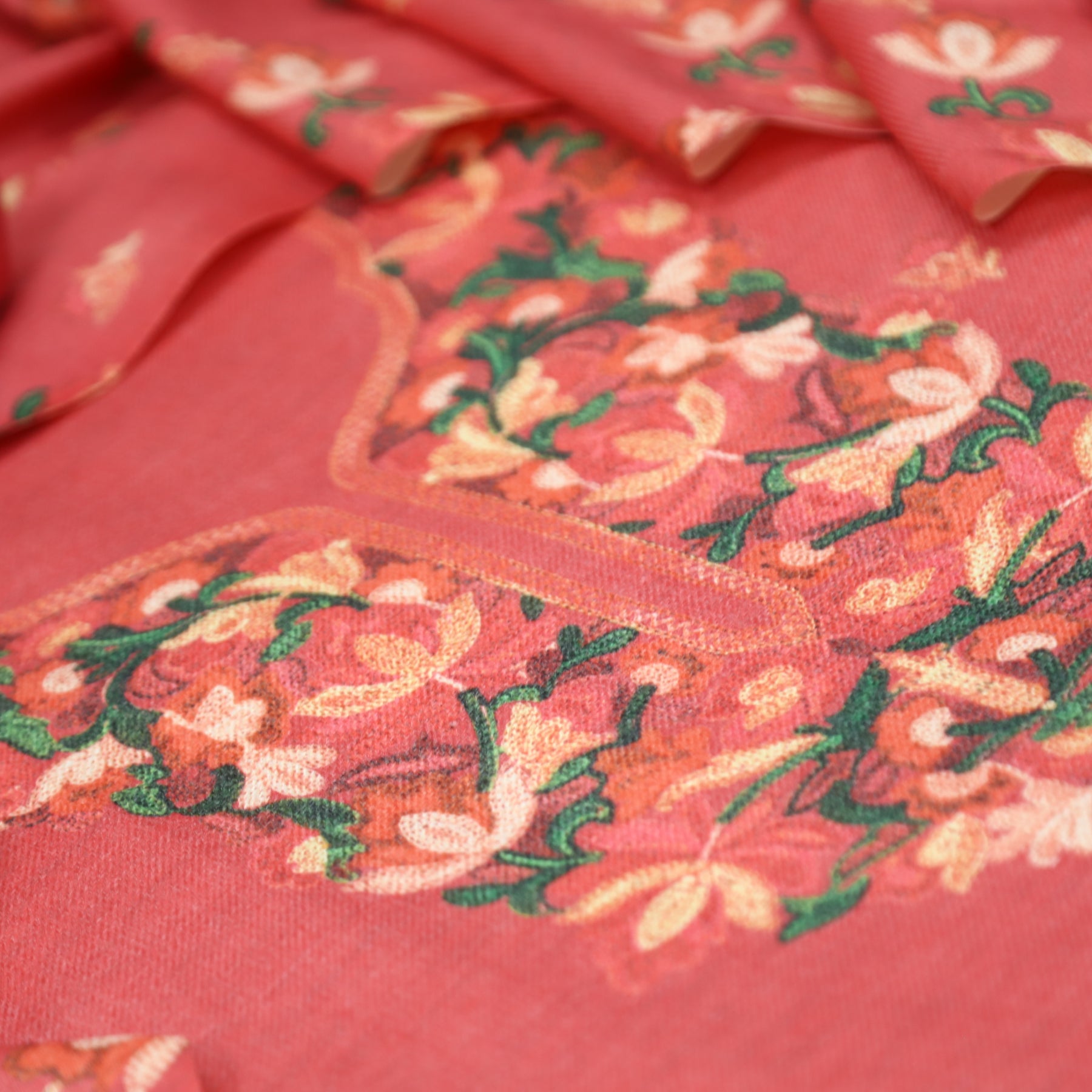 लिहाजी Coral Peach Kashida Digital Floral Printed Semi Pashmina Winter Set