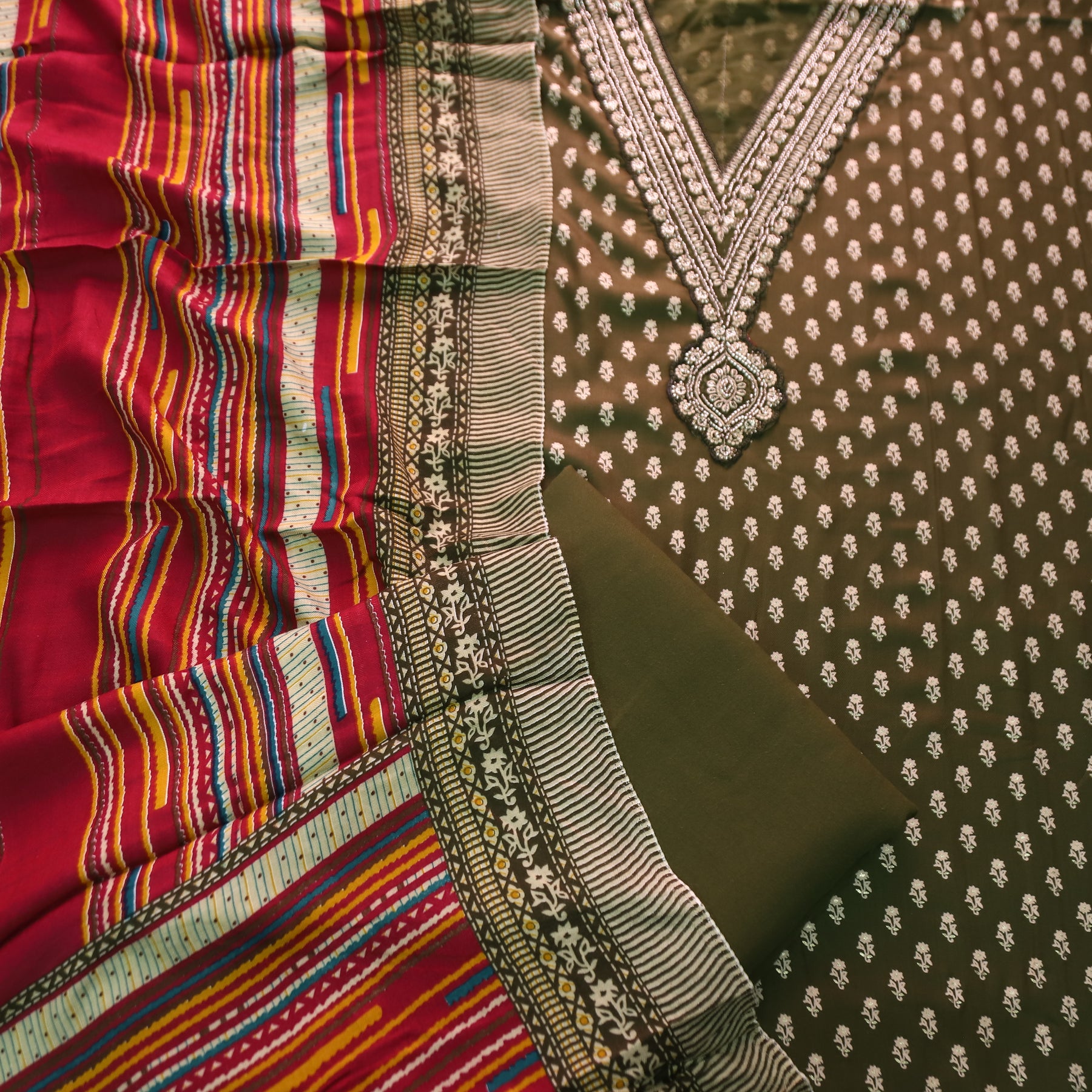 सरवरी Olive Green Embellished V Neckline Foil Work Semi Pashmina Winter Set