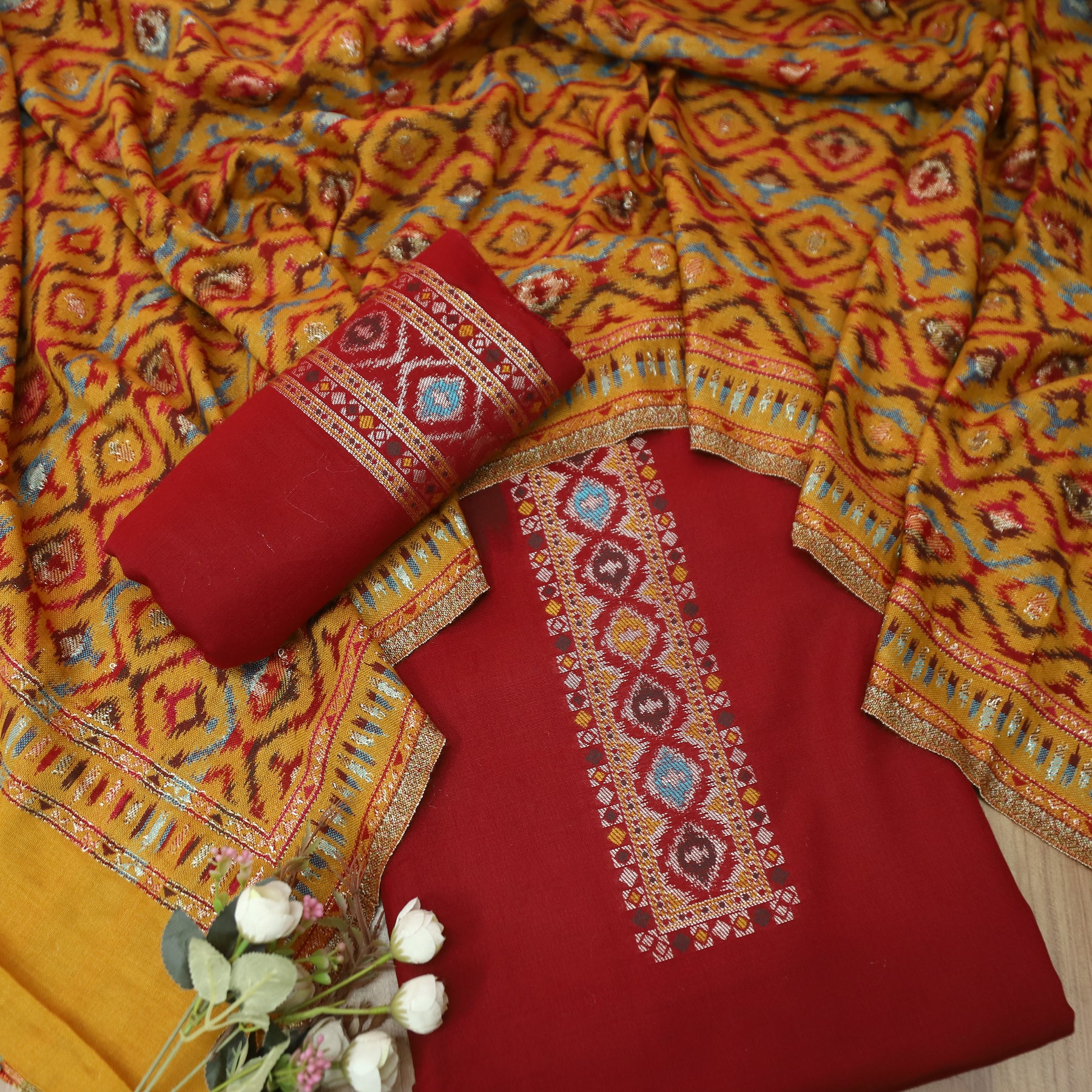 कमलिया Cherry Red Thread Weaved Neck with Zari Semi Pashmina Suit Set