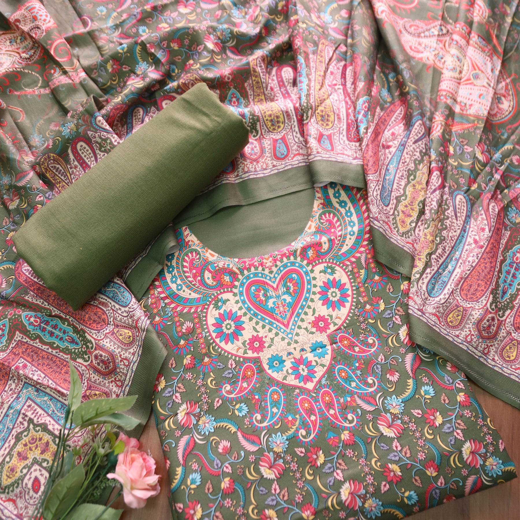Yashvi Grass Green All Over Digital Floral Printed Semi Pashmina Winter Set