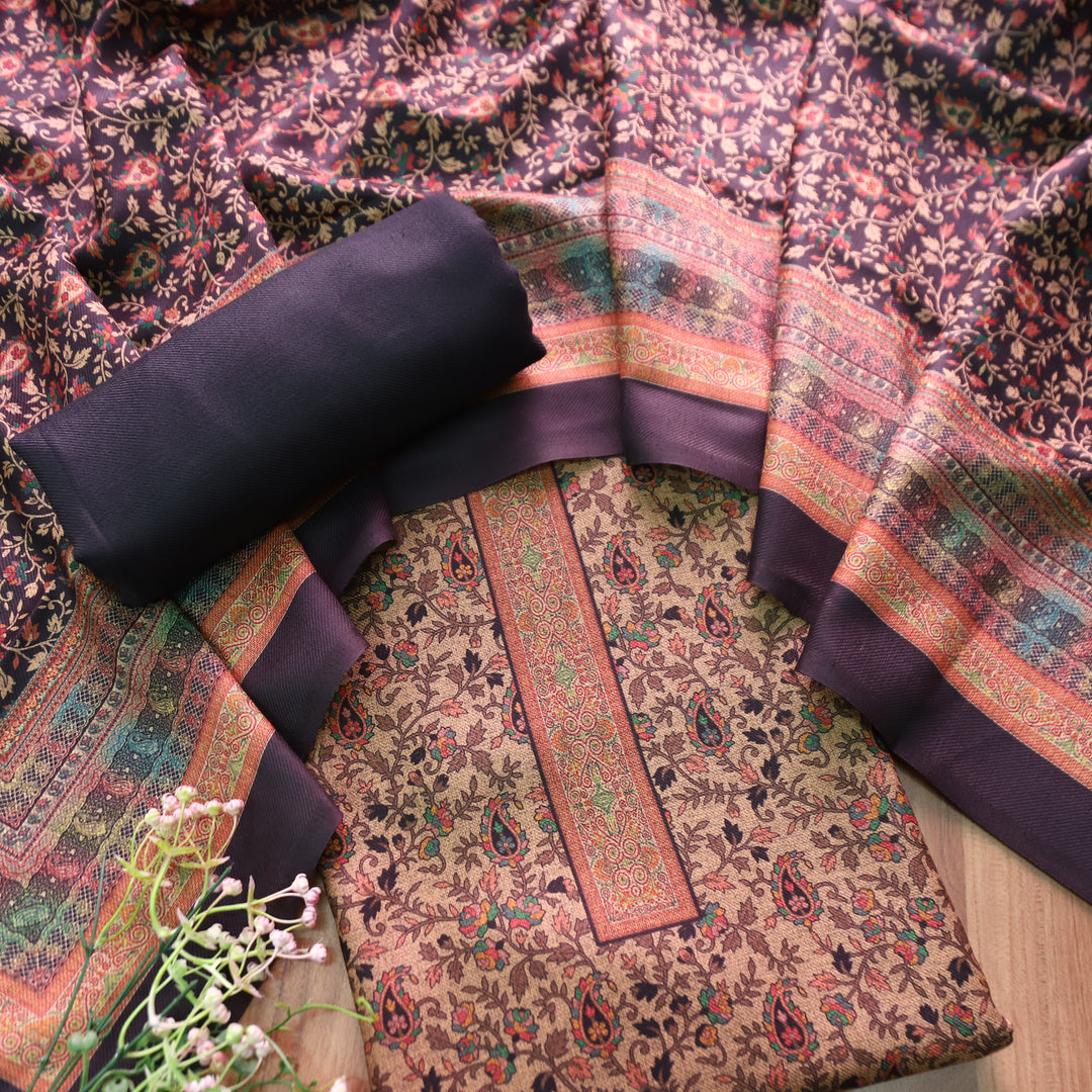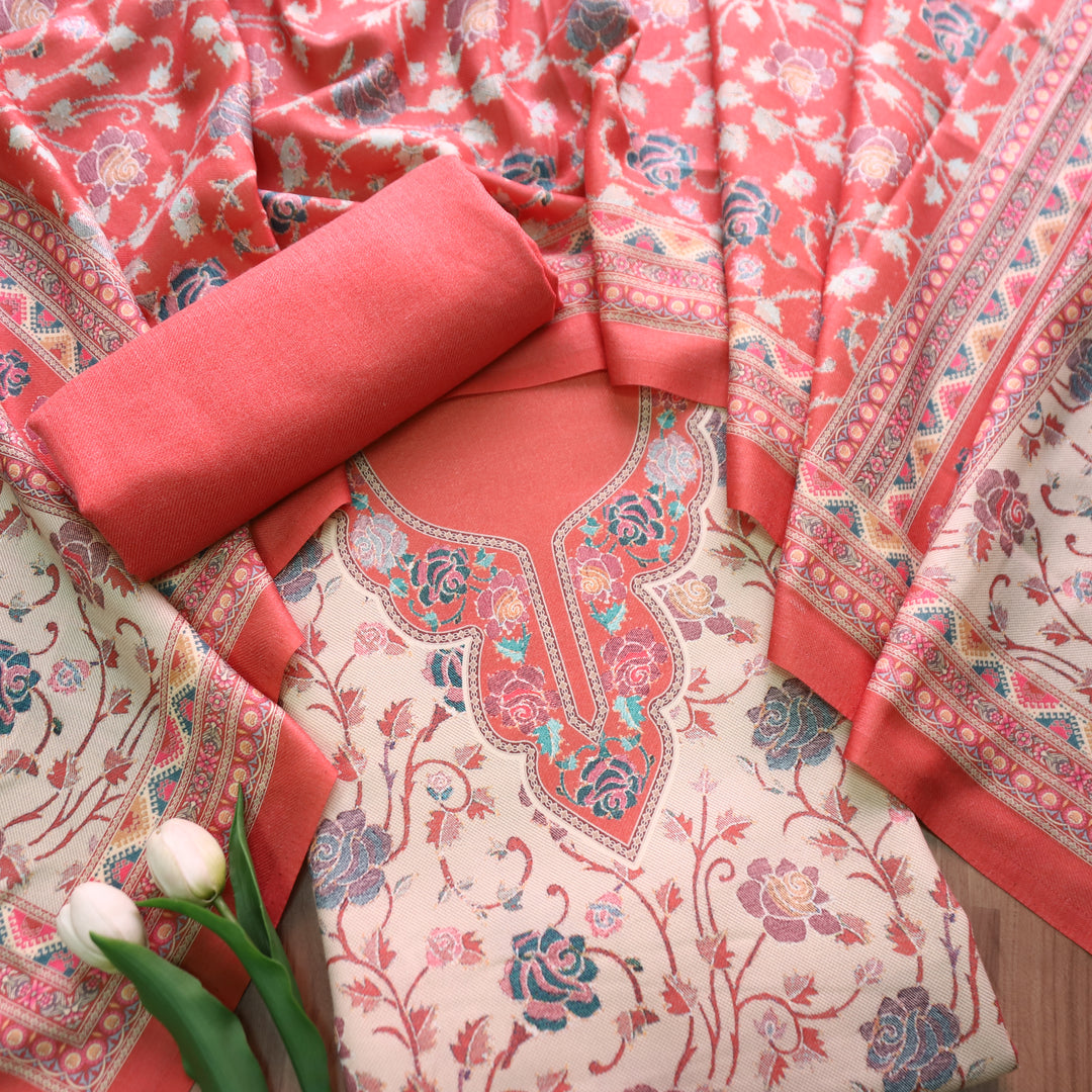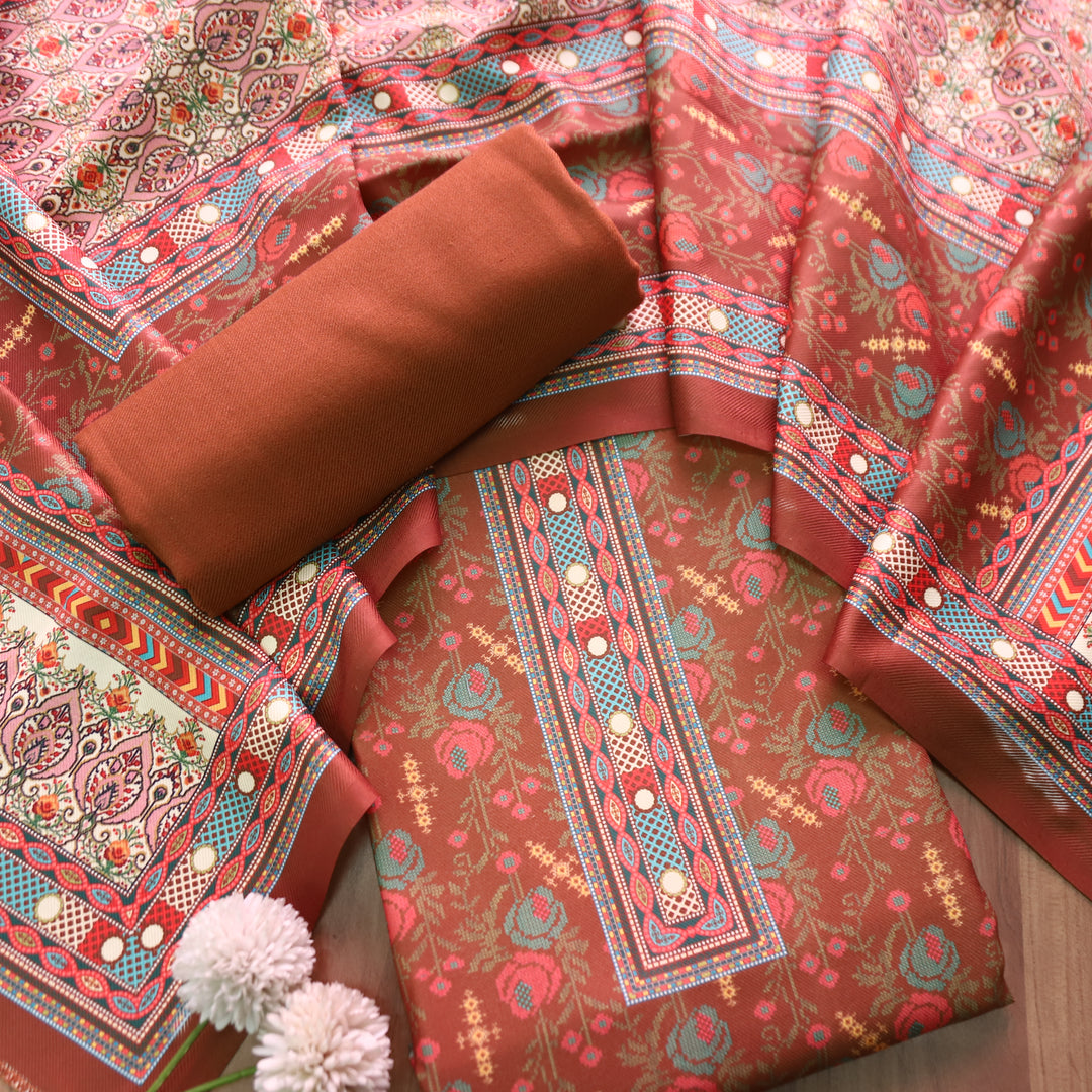 राधिका Coral Rust All Over Floral Print Semi Pashmina Winter Suit Set