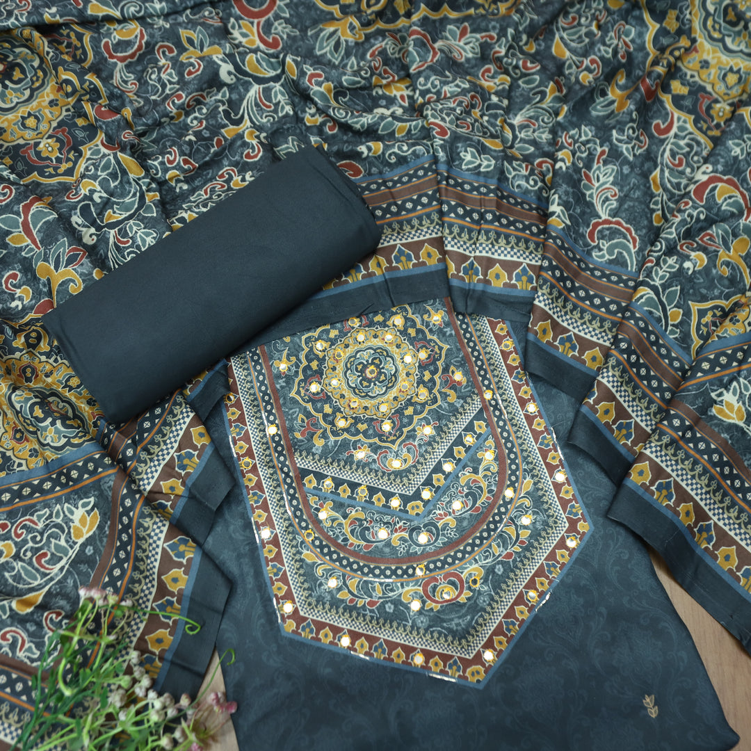राजकोटि Charcoal Grey Balanced Digital Print with Patra Work Semi Pashmina winter Set