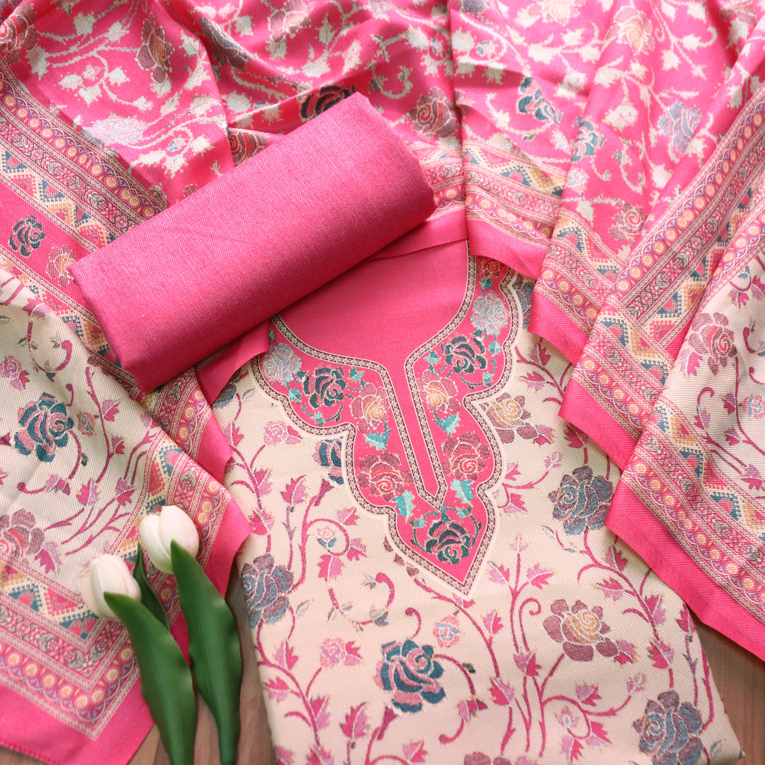 राधिका Punch Pink All Over Floral Print Semi Pashmina Winter Suit Set