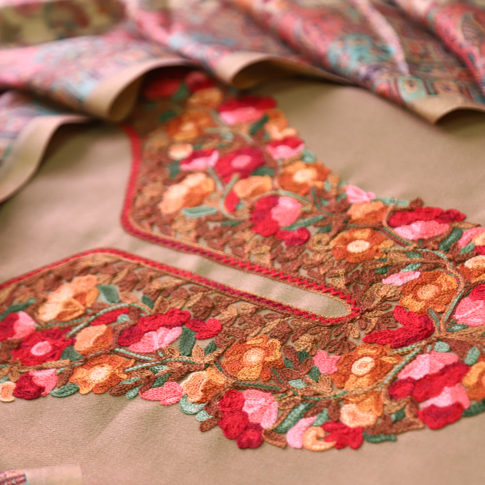 रूपसिद्धि Sand Beige Aari Style Thread Embroidery Work Semi Pashmina Winter Set
