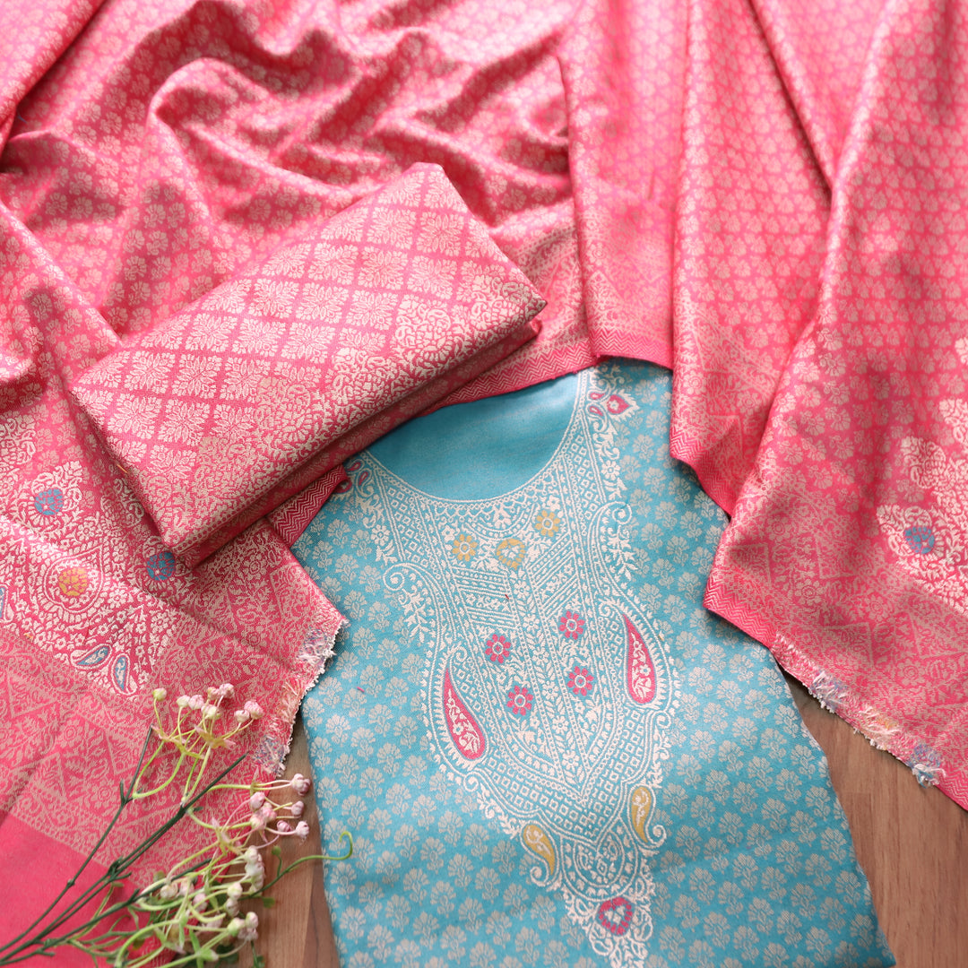 रोशनी Aqua Sea Blue All Over Zari Weaved in Semi Pashmina Winter Suit Set