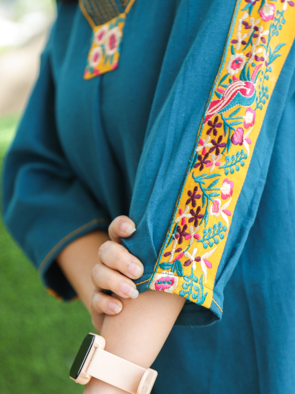 Belliza Royal Teal with Embroidered V Neck and Sleeve Work Short Cotton Kurti