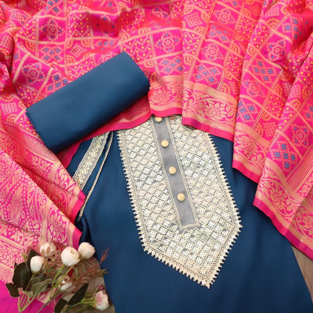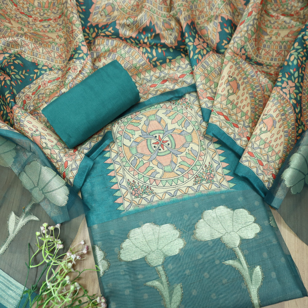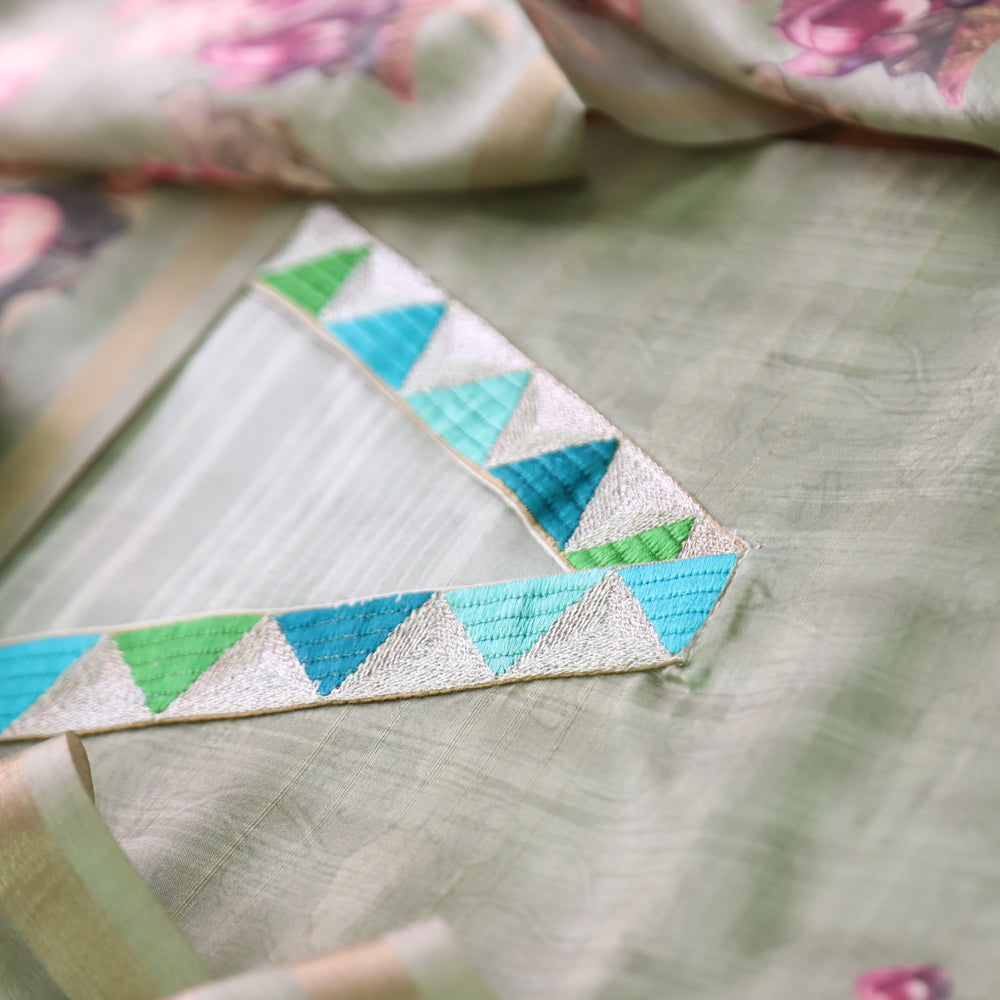 Hayaat Sea Form Sage Thread Embroidered Work Neck with Zari Dola Silk Set