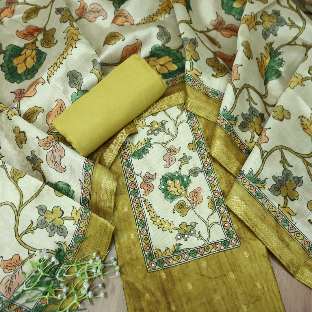 Subharam Soft Hazel Kalamkari Printed Yoke with Zari Work Printed Art Silk Chanderi Set