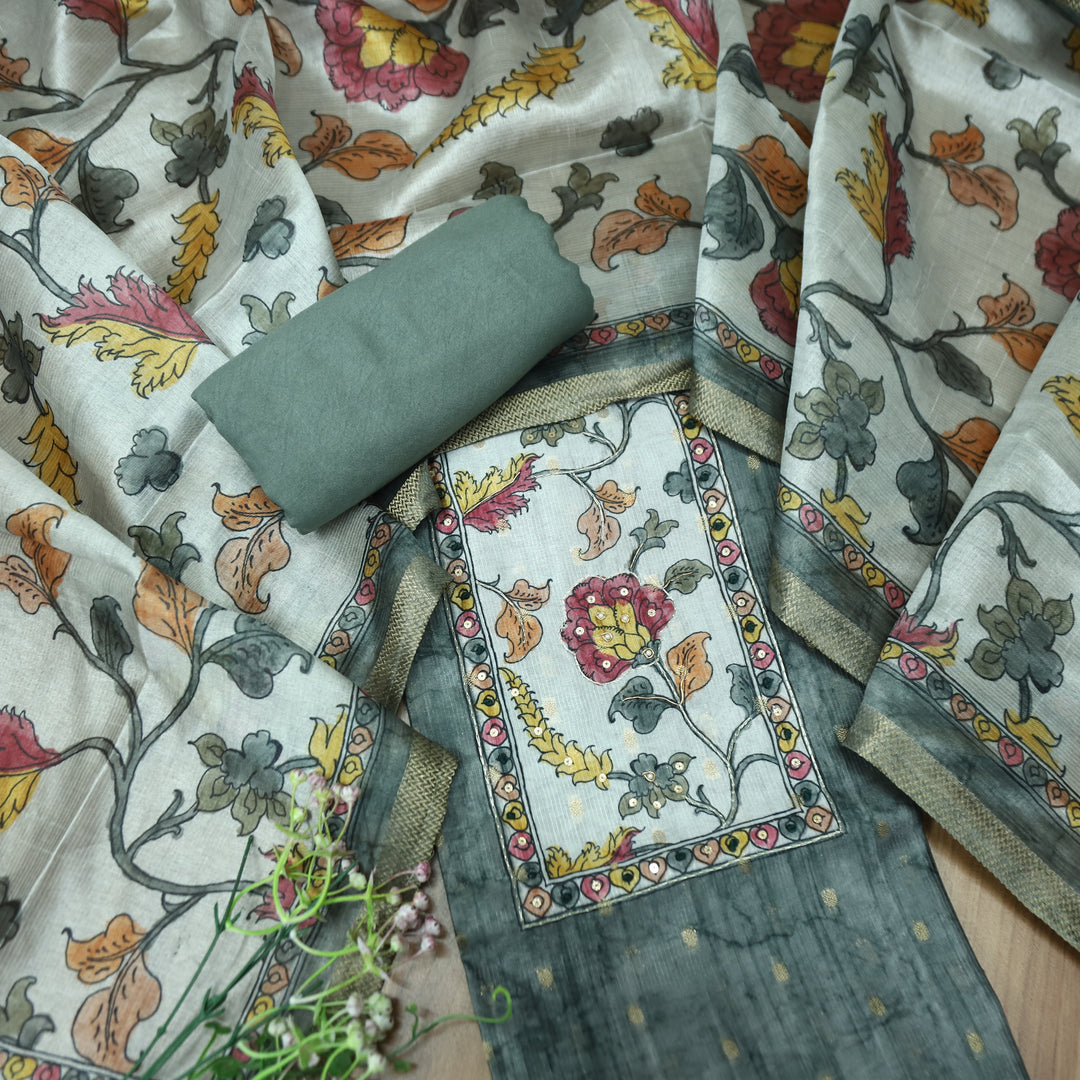 Subharam Sky Grey Kalamkari Printed Yoke with Zari Work Printed Art Silk Chanderi Set