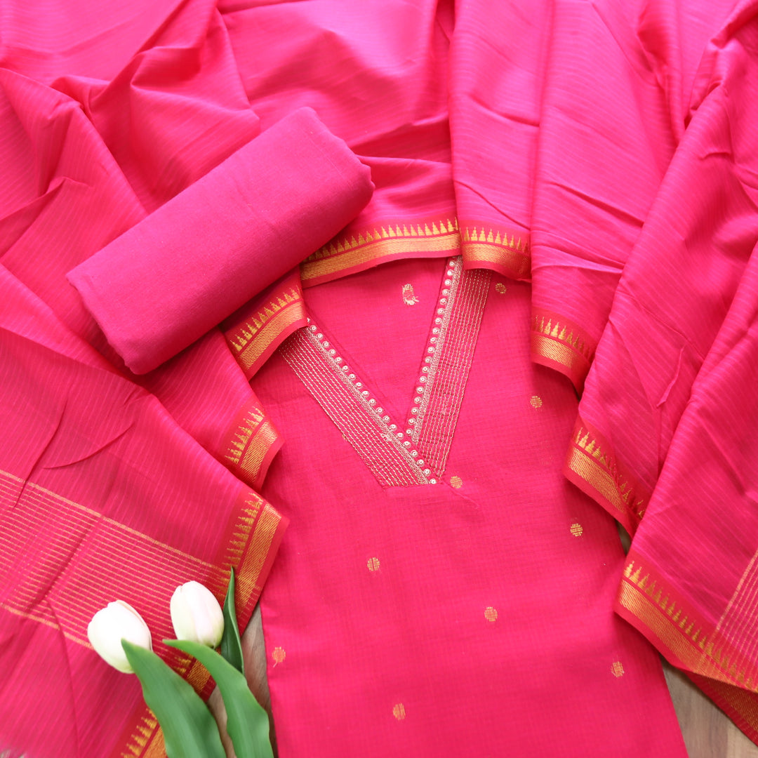 Saloni Rani Pink V Neck Zari Work in Dual Shade Weaved South Cotton Suit Set