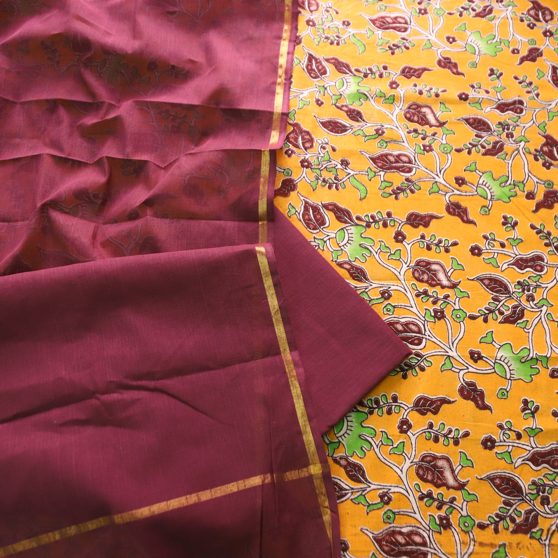 Description- Very elegant South cotton suit set crafted in breathable fabric, featuring all-over Kalamkari hand block printed motifs on the top. The rich traditional prints reflect timeless artistry, making it a perfect choice for graceful everyday wear, festive mornings, and cultural occasions.