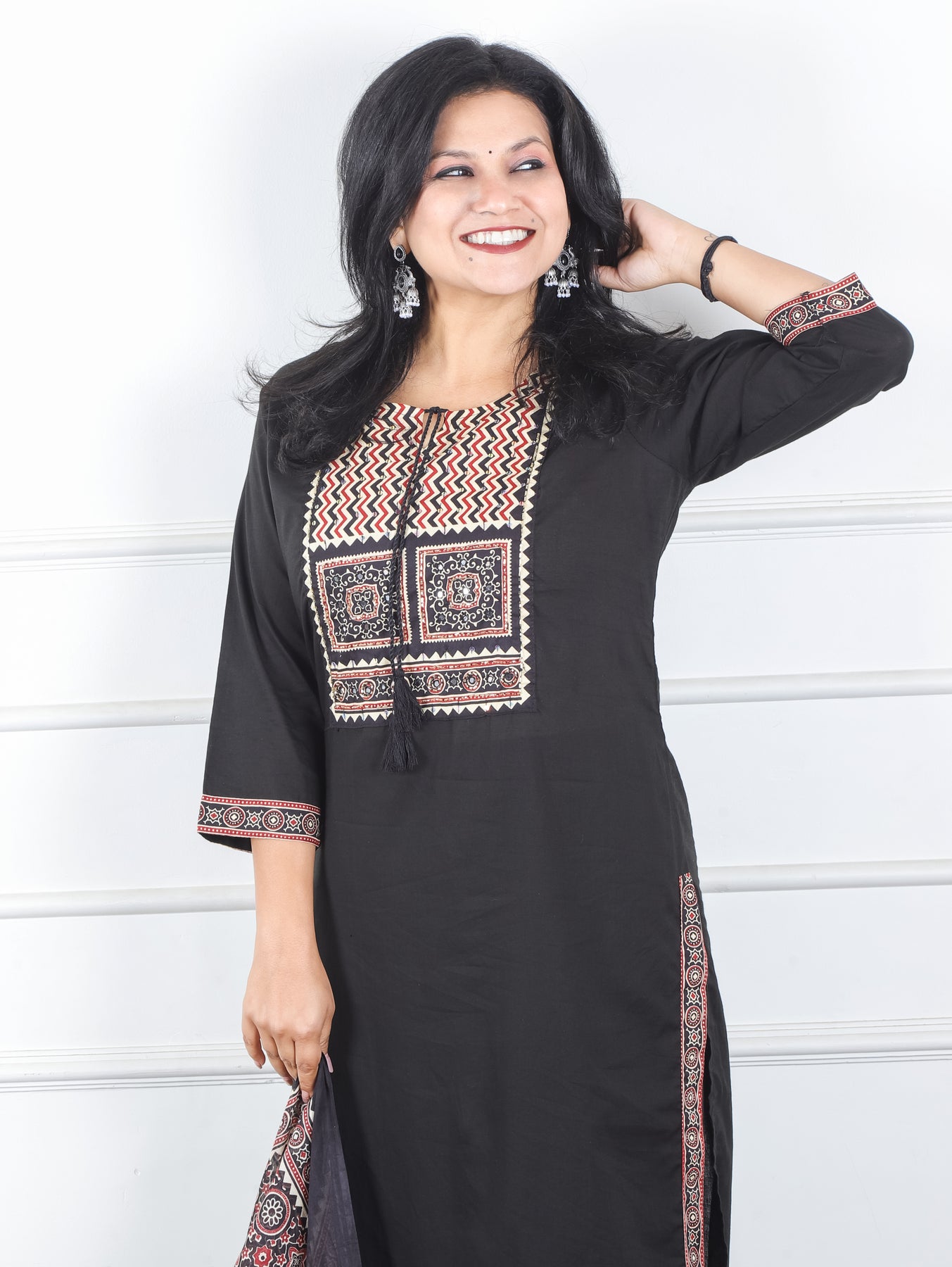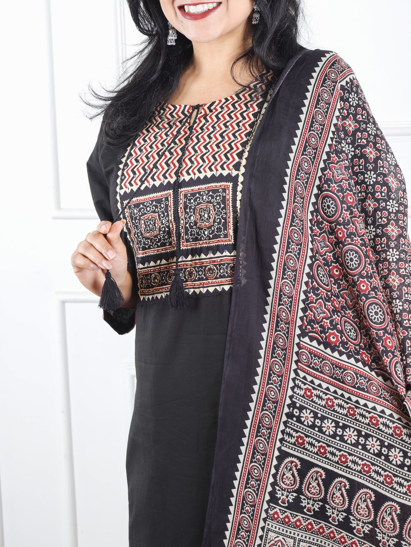 Sunaina Midnight Black Kardana and Patra Printed Yoke with Knot Cotton 3 Piece Set