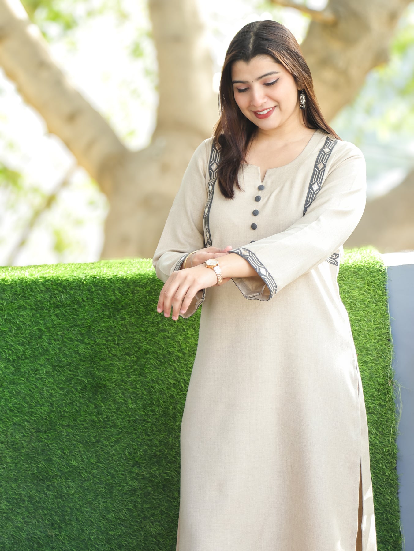 Neck: Round Neck with Button and Embroidered