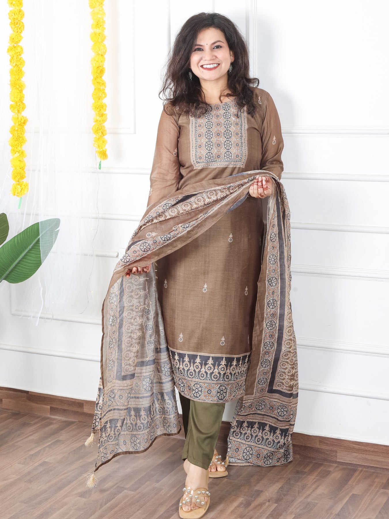 Mivaan Olive Green All Over Digital Printed with Kantha Work Chanderi 3 Piece Set
