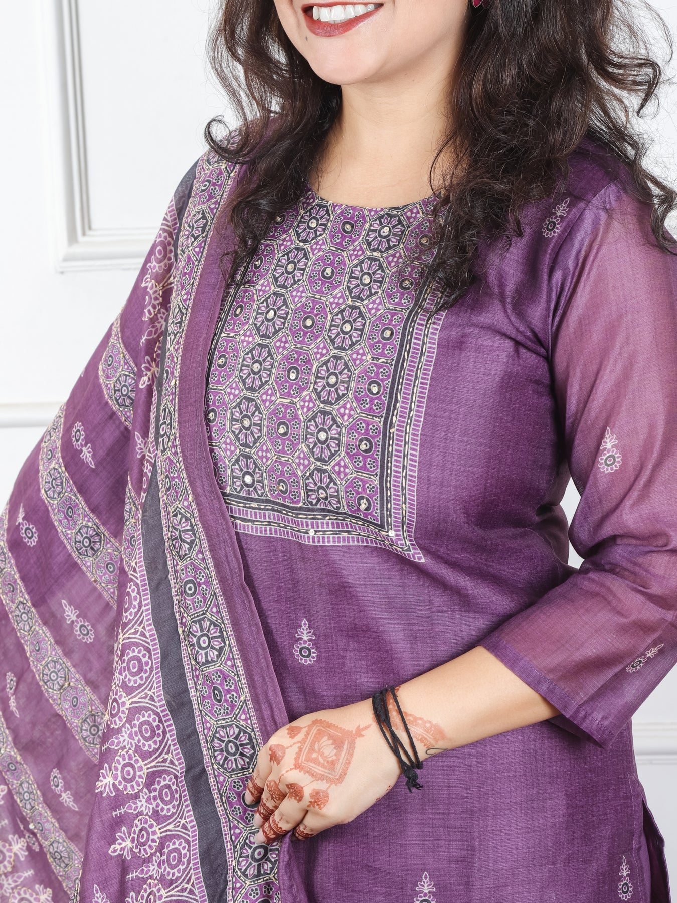 Mivaan Orchid Purple All Over Digital Printed with Kantha Work Chanderi 3 Piece Set