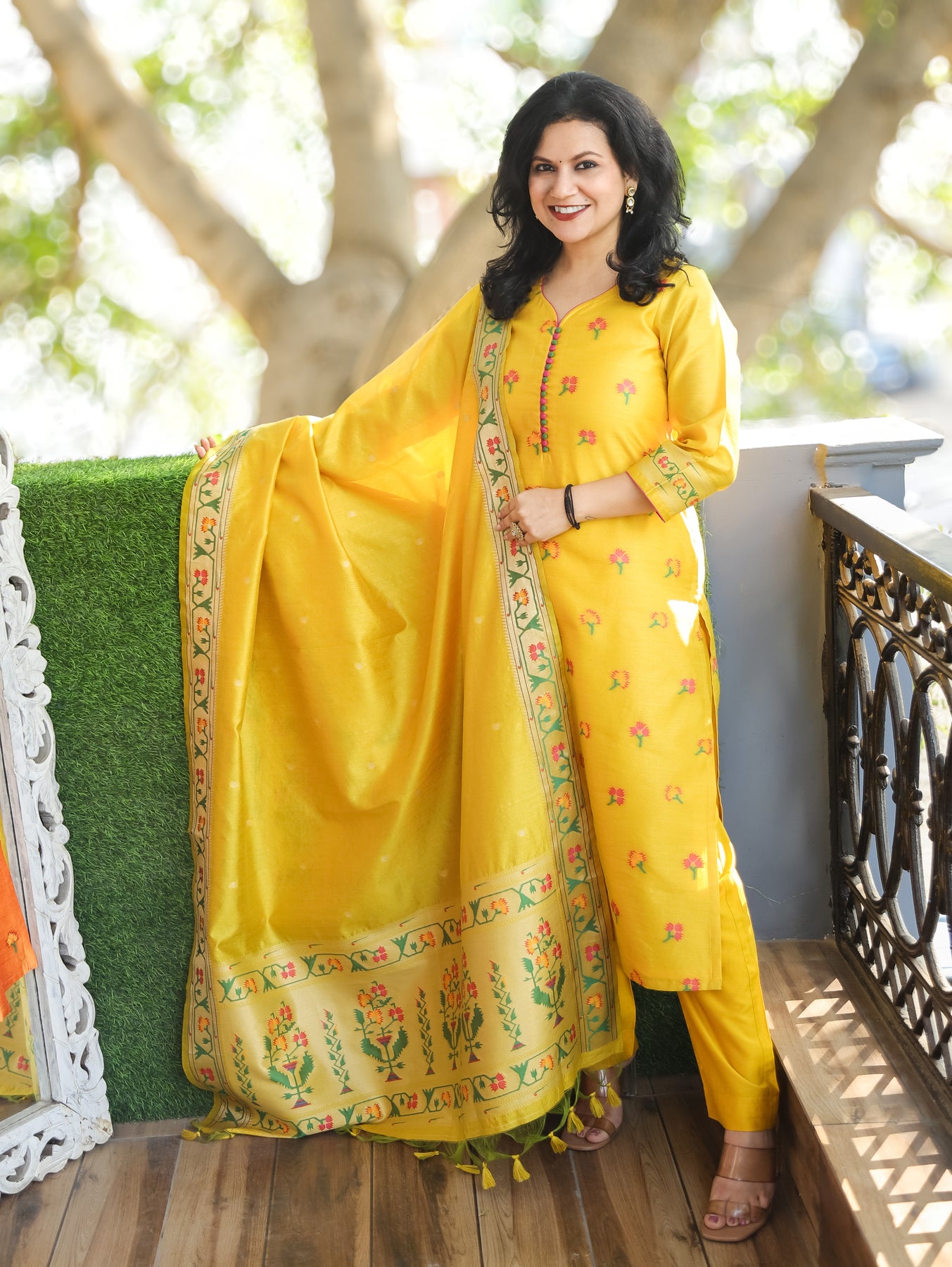 Pranda Yellow Jamdani Jacquard Weaved Paithani Inspired Tussar Silk 3 Piece Set