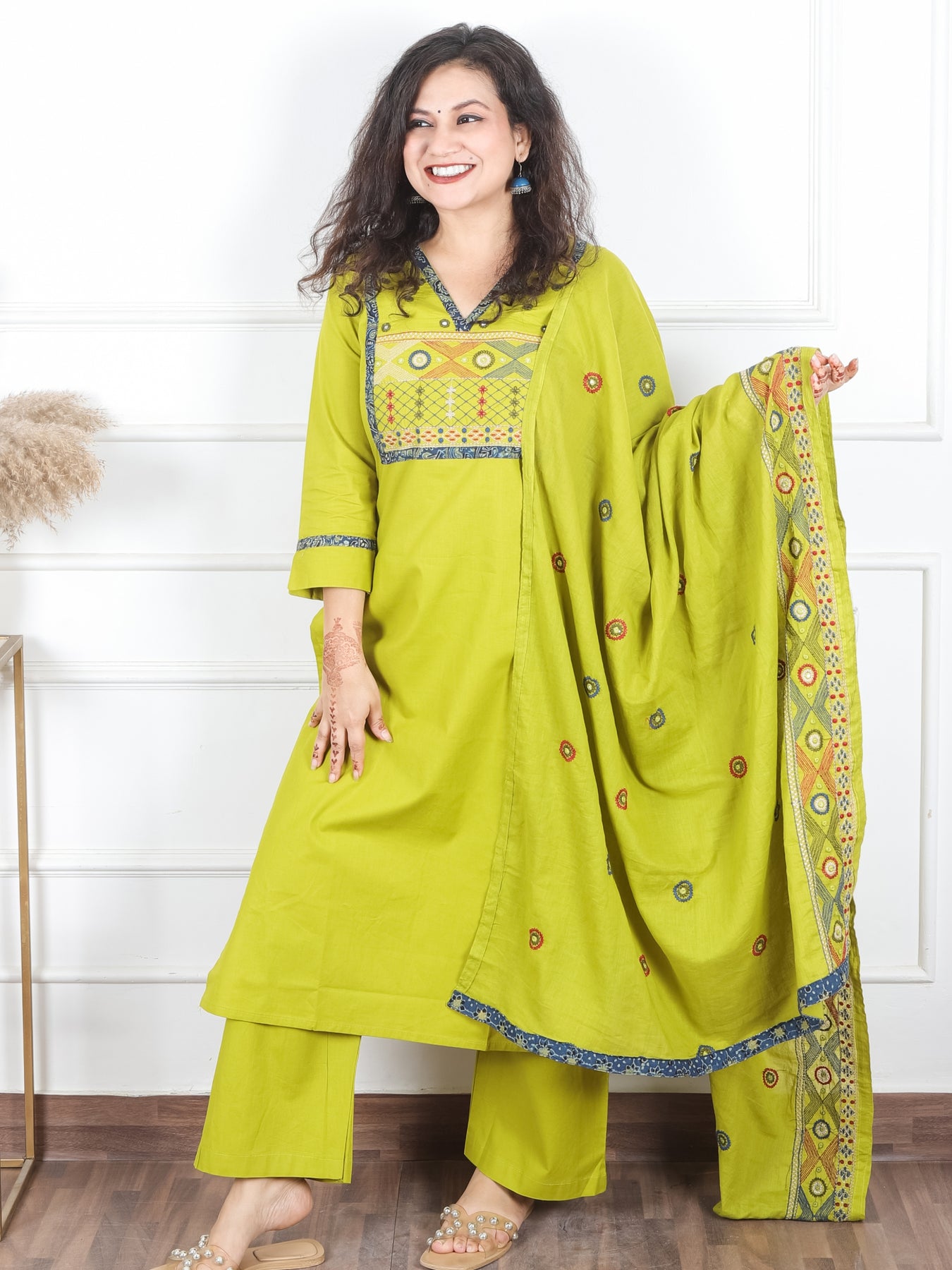 Roshni Lemon Green Thread Embroiered Neck with Patra Detailing Cotton 3 Piece Set