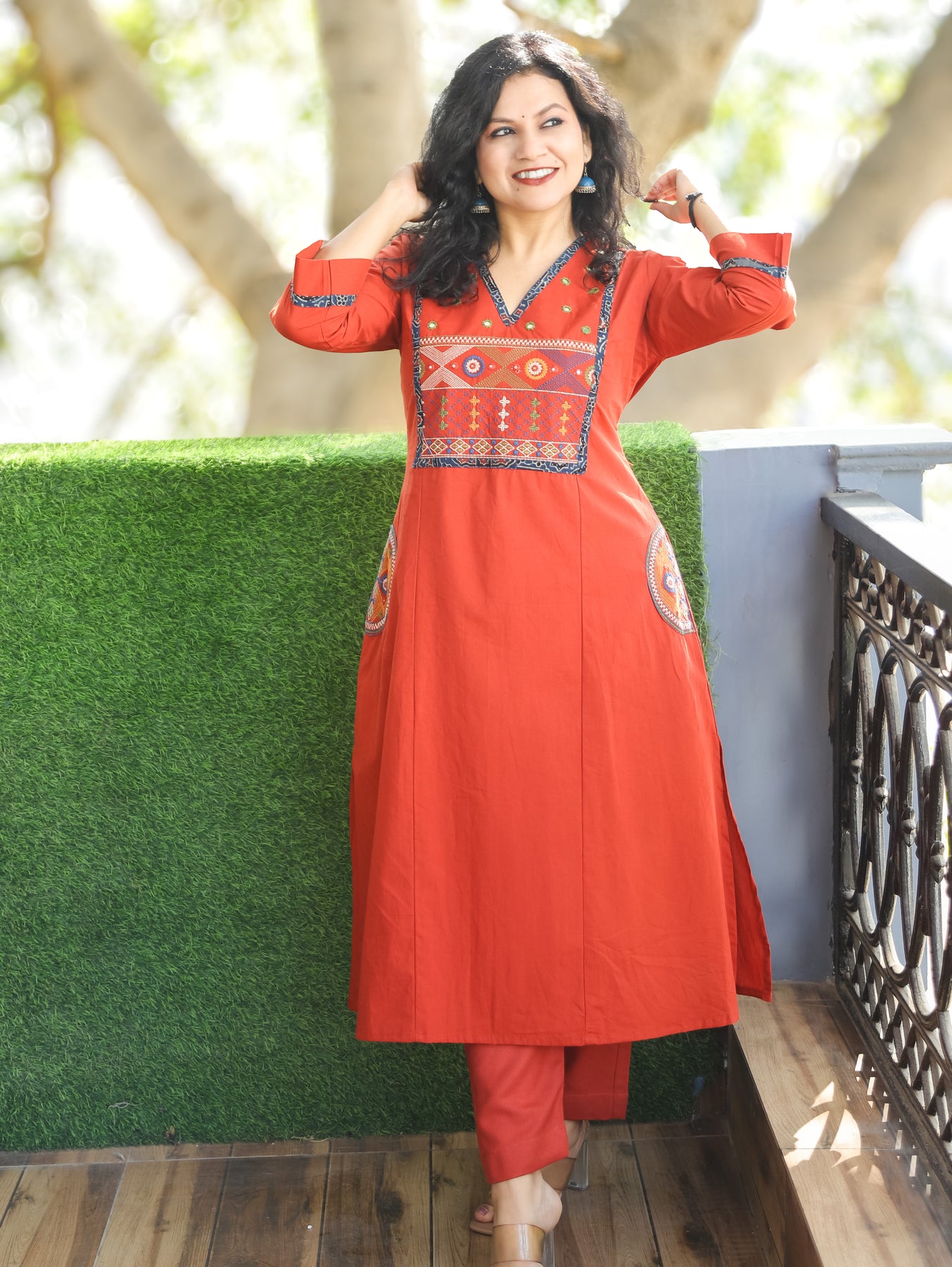 Keshvi Rust Orange Thread Embroiered Neck with Patra Cotton Kurti with Pocket